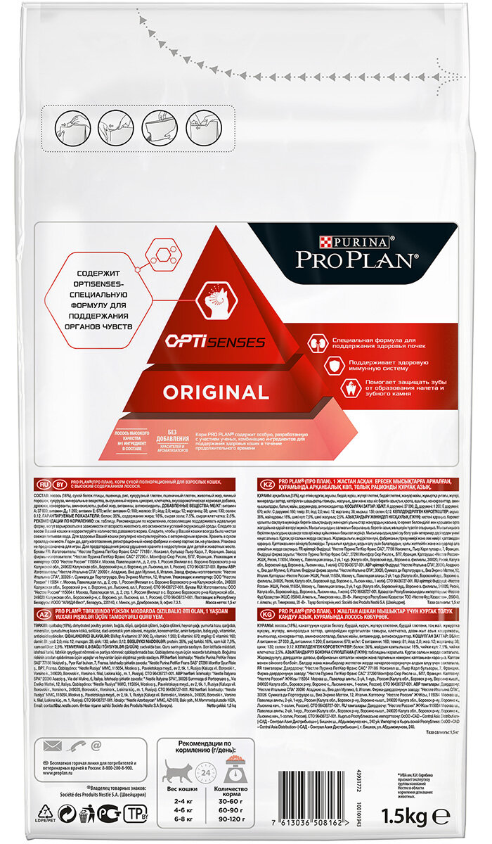 Эксперты по рационам для кошек PRO PLAN разработали рецептуру Original Optisenses Adult — сухие корма для кошек со специальной формулой, которая поддерживает органы чувств кошки.