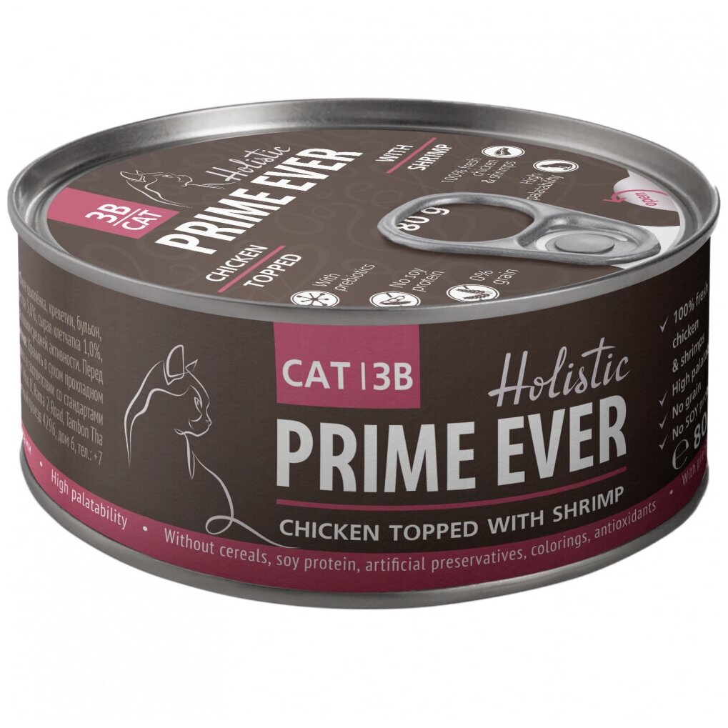 Дополнительное влажное питание холистик класса Prime Ever Chicken Topped With Shrimp - это сочетание нежнейшего мяса цыпленка с аппетитными креветками. Ваш питомец будет иметь непревзойденный внешний вид и здоровую пищеварительную систему. Подается в виде аппетитного желе. Корм обладает высокой вкусовой привлекательностью. Не содержит злаков, соевого белка, ГМО, искусственных консервантов, красителей и ароматизаторов. В состав включены пребиотики. Корм изготовлен в соответствии со стандартами FEDIAF (Европейская федерация производителей кормов для животных) из ингредиентов, пригодных в питании человека (human grade). Prime Ever - ресторан высокой кухни для домашних питомцев! Одна банка в день на 4 кг веса кошки средней активности. Перед кормлением подогреть корм до комнатной температуры. Обеспечьте кошке свободный доступ к чистой питьевой воде.Состав:Сырой протеин 12,5%, сырой жир 0,4%, минеральные вещества 3,0%, сырая клетчатка 1,0%, кальций 0,004%, фосфор 0,05%, влажность 86,0%. Филе цыплнка, креветки, бульон, желирующая добавка, фруктоолигосахариды (ФОС), витамин E.