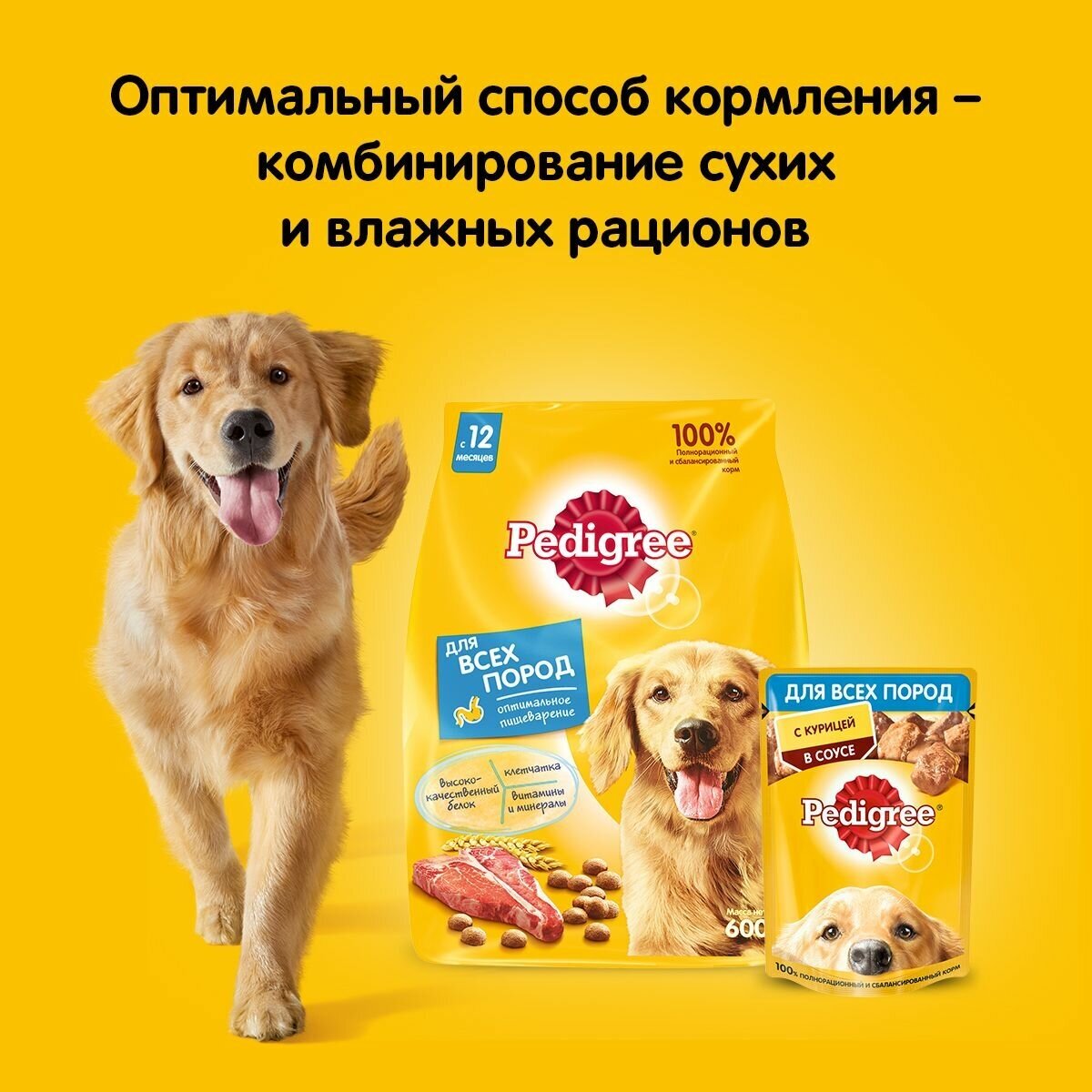 Собаки дарят нам так много! Поэтому в ответ они должны получать только лучшее. Корм PEDIGREE® для взрослых собак содержит всё, что нужно питомцам старше года. Наш рацион оптимально сбалансирован и насыщен необходимыми витаминами и минералами. И конечно же, мясные кусочки в соусе такие вкусные, что нос оближешь!Бренд PEDIGREE® рекомендует сочетать разные форматы корма в рационе Вашей собаки. Утром и вечером Вашему питомцу нужно давать влажный рацион, а в течение дня — сухой. Это позволит объединить преимущества каждого из форматов, ведь ее рацион должен быть не только вкусным, но и тщательно сбалансированным. Нужно помнить, что смешивать в одной миске сухой и влажный рационы не рекомендуется. Кроме того, у вашей собаки всегда должен быть доступ к чистой питьевой воде. Рационы PEDIGREE® содержат все необходимые витамины и минералы, белки, жиры и углеводы, чтобы поддержать здоровье Вашей собаки.Хранить при температуре от + 4*С до + 35*С и относительной влажности воздуха не более 75%