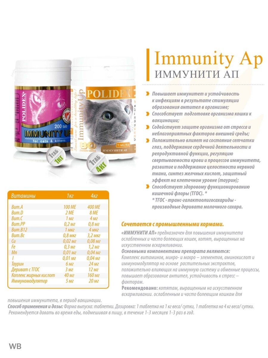 Форма выпуска, состав и упаковка: Таблетки от бежевого до светло-серого цвета с темными вкраплениями.В 1 таблетке содержит: витамин A — 100 МЕ, витамин D — 2 МЕ, витамин C — 1 мг, витамин B5 — 0,2 мг, витамин B12 — 1 мкг, витамин Bc — 0,8 мкг, медь — 0,02 мг, железо — 0,3 мг, марганец — 0,01 мг, йод — 0,01 мг, таурин — 6 мг, дериват с тогс — 3 мг, комплекс незаменимых жирных кислот — 40 мг, иммуномодулятор — 5 мг, а также вспомогательные компоненты. Не содержит искусственных отдушек и красителей. Расфасовывают по 200 таблеток в пластиковые банки.Фармакологические (биологические) свойства и эффектыБиологические свойства обусловлены содержанием комплекса витаминов, минералов и аминокислот, иммуномодулятора растительного происхождения. Положительно влияет на иммунную систему и обменные процессы, повышает образование антител.Восстанавливает и регулирует следующие процессы в организме: стимулирует иммунную систему, действуя на клеточном и гуморальном уровнях (иммуномодулятор на основе растительных экстрактов); повышает образование антител, защитных функций организма (витамины С, А, группа В); обмен веществ (витамины А, B12, В5, С); работа желез внутренней секреции (йод); поддержание кроветворной функции организма (железо, марганец, медь); улучшение состояния сетчатки глаз, поддержание сердечной деятельности и репродуктивной функции, регуляция свертываемости крови и процессов иммунитета, развитие и поддержание целостности нервной ткани, синтез желчных кислот (таурин); нормализация свертывания крови, функционирование репродуктивной и желудочно-кишечной систем (арахидоновая и линоленовая кислоты); способствует нормализации кишечной флоры (тгос).Показания к применению препарата для повышения иммунитета ослабленных и часто болеющих кошек; в период вакцинации; котятам, выращенным на искусственном вскармливании.Порядок применения:Комплекс применяют перорально или замешивают в корм из расчета 1 таб./1 кг веса/сут.Применяется в течение 1-3 месяцев, 1-3 раз в год.Побочные эффекты: Побочных явлений при применении добавки не выявлено.Противопоказания к применению препарата: Противопоказаний не установлено.Особые указания и меры личной профилактики: Кормовая добавка совместима со всеми кормами, лекарственными препаратами и другими кормовыми добавками.Условия хранения: Кормовую добавку следует хранить в упаковке производителя, в сухом, защищенном от прямых солнечных лучей, недоступном для детей месте при температуре от 5°С до 25°С.Срок годности – 2 года со дня изготовления. Запрещается использование кормовой добавки после окончания срока годности.