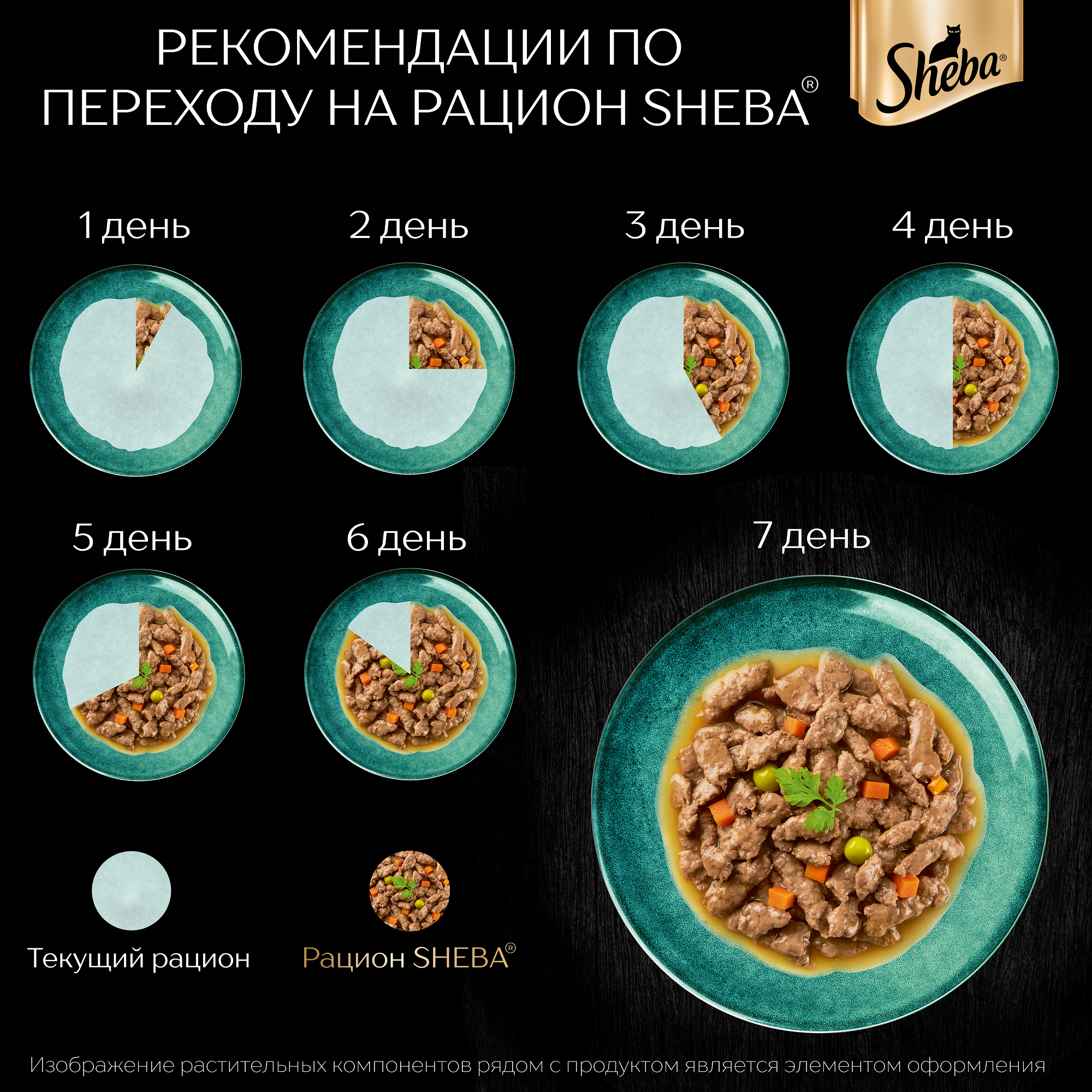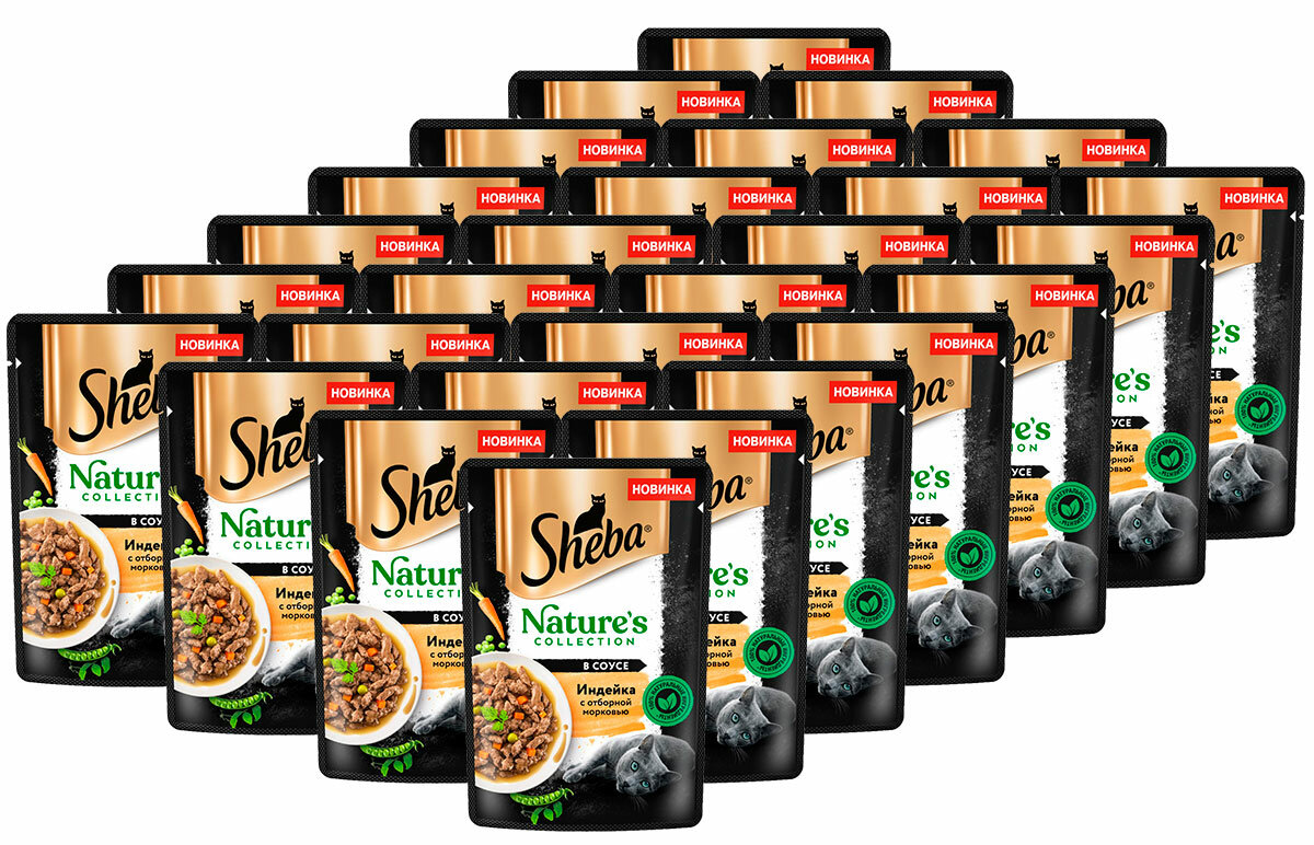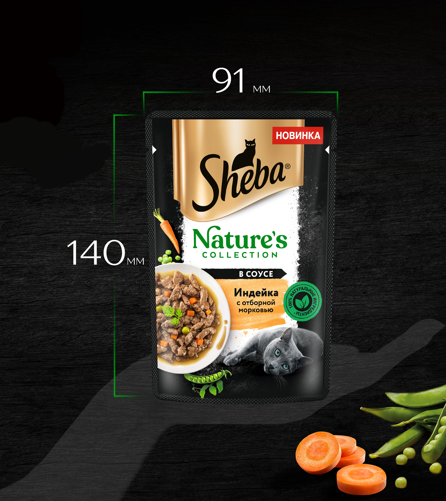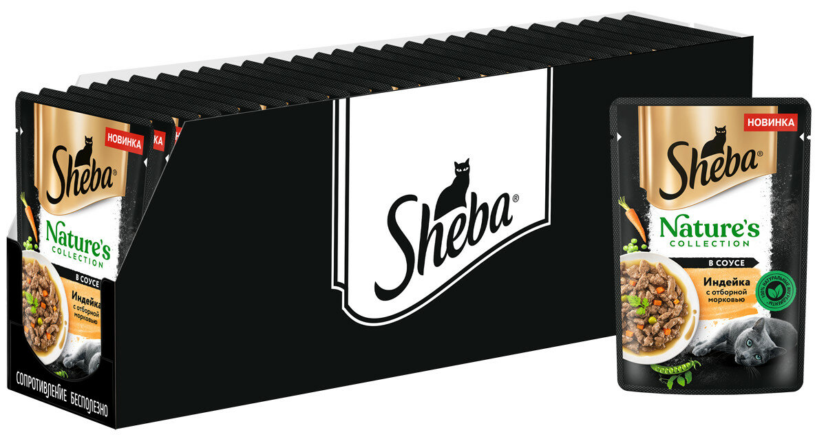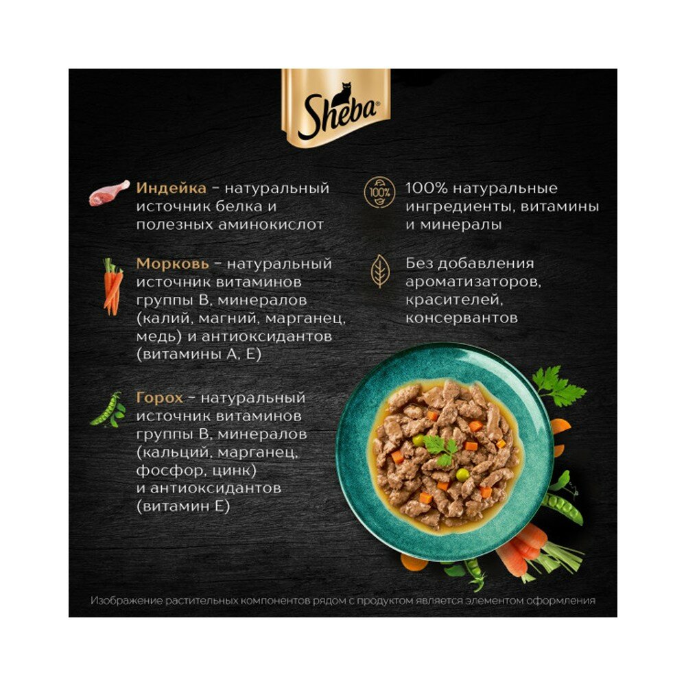 Паучи Шеба для кошек Индейка и Морковь Паучи (цена за упаковку) - Индейка с отборной морковью и добавлением цельного горошка - мастерски приготовленное блюдо, которое сочетает в себе красоту вкуса и пользы ингредиентов, подаренных нам природой. Индейка – натуральный источник белка и полезных аминокислот, морковь - натуральный источник витаминов группы B, антиоксидантов (витамины A, E) и минералов (калий, магний, марганец, медь), а горох - натуральный источник витаминов группы B, антиоксидантов (витамин Е) и минералов (кальций, марганец, фосфор, цинк). Сочетание высококачественного протеина, овощей и нашего фирменного соуса покорит сердце вашей любимицы.Для взрослой кошки среднего веса (4 кг) необходимо 3,5 - 4,5 пакетика в день. Вашу кошку следует кормить продуктом комнатной температуры.состав: мясо и субпродукты (в том числе индейка), пшеничная мука, загустители, аминокислоты (в том числе таурин), минеральные вещества, пивные дрожжи, овощи (в том числе морковь), витамины, сахара.содержание питательных веществ (100 г): белок - 7,5 г; жир - 3,0 г; зола - 1,7 г; клетчатка - 1,9 г; влага - 83 г; витамин А - не менее 100 МЕ; витамин Е - не менее 1 мг. Энергетическая ценность (100 г): 65 ккал / 272 кДж.Хранить при температуре от + 4*С до + 35*С и относительной влажности воздуха не более 75%.