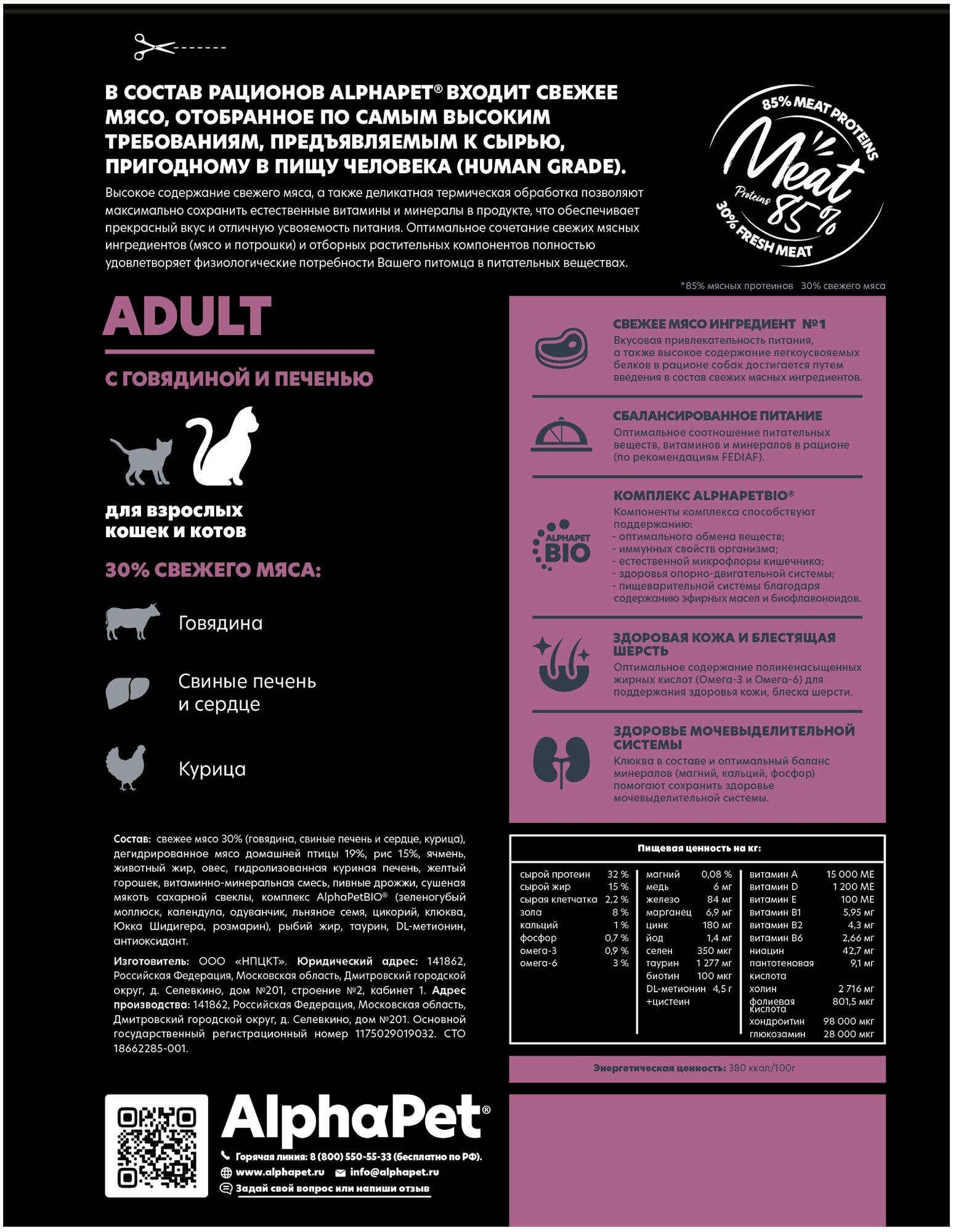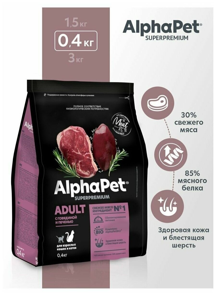 AlphaPet Сухой корм для взрослых кошек с говядиной и печенью 400 г
