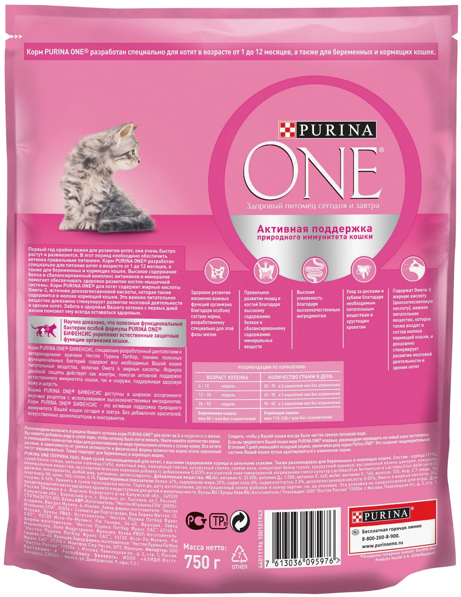 Первый год крайне важен для развития котят, они очень быстро растут и развиваются. В этот период необходимо обеспечить котенка правильным питанием. Корм PURINA ONE разработан специально для питания котят в возрасте от 1 до 12 месяцев, а также для беременных и кормящих кошек. Высокое содержание белка и сбалансированный комплекс витаминов и минералов помогает обеспечивать здоровое развитие костно-мышечной системы. Корм PURINA ONE для котят содержит жирные кислоты Омега-3, источник докозагексаеновой кислоты, которая также содержится в молоке кормящей кошки. Это важное питательное вещество доказанно стимулирует развитие мозговой деятельности и зрения котят. Забота о здоровье Вашего котенка с первых дней жизни поможет ему всегда оставаться здоровым.
