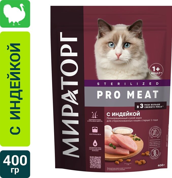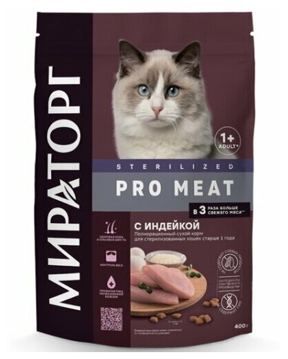 Корм сухой, для стерилизованных кошек старше 1 года, с индейкой, 400 грКорм мираторг PRO MEAT создан для животных с особыми вкусовыми предпочтениями. Высокое содержание свежего диетического мяса, премиальный состав углеводов с адаптивным гликемическим индексом, умеренный уровень клетчатки, витамины и минералы обеспечат питомцев энергией для здоровой и активной жизни. Корм обогащен премиальными источниками витаминов, микроэлементов и полезных веществ. После кастрации и стерилизации предрасположенность кошек к появлению избыточной массы тела и мочекаменной болезни возрастает. С учетом этих особенностей был создан полнорационный корм PRO MEAT. Умеренное содержание калорий, баланс минералов и свежее мясо в составе снизят вероятность появление лишнего веса и мочекаменной болезни.