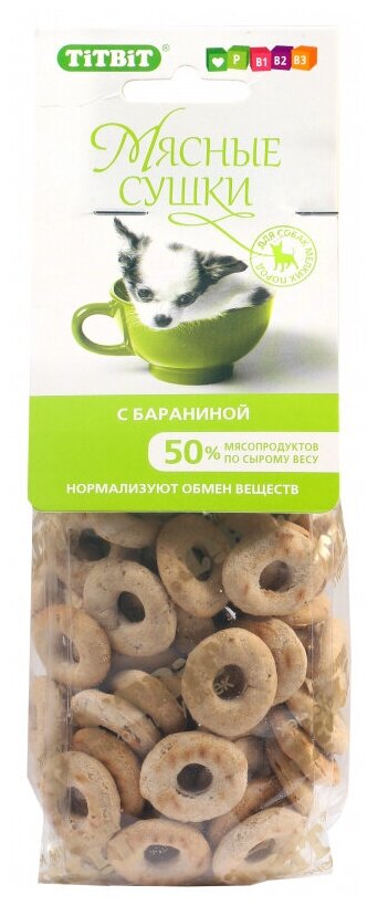 Кто же не любит сушки? А сушки с бараниной ТиТБиТ специально разработанные для собачек мелких пород уж точно порадуют вашего четвероногого питомца. Отличный состав ингредиентов, а также мясной аромат и вкус не оставят равнодушным даже самого капризного привередливого пса. Всем известно, что баранина, входящая в состав сушек, благотворно влияет на здоровье и внешний вид собак, а фрукты и ягоды содержат огромное количество витаминов и минеральных веществ.