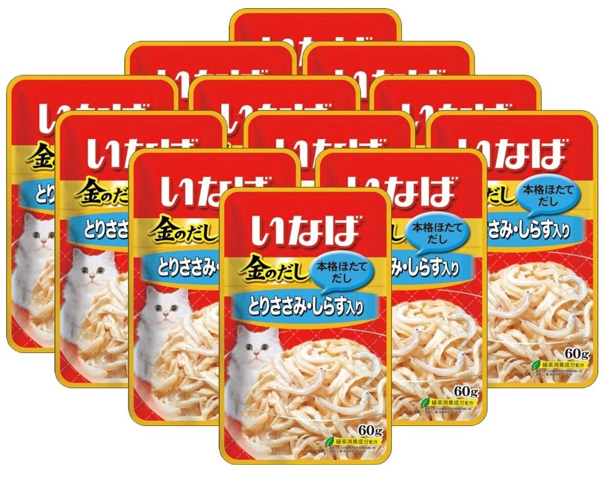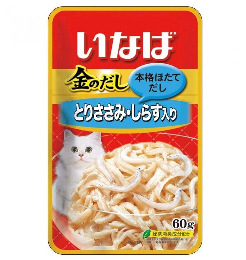 Влажный консервированный корм для кошек INABA (Инаба) Киннодаси ("Со смаком") Куриное филе и мальки ширасу в желе паучи 60г (12 шт.). Паучи на основе куриного филе с добавлением мальков, волокна в желе. Серия влажных кормов «Со смаком» - это парное филе курицы, с добавлением морских деликатесов - мальков ширасу, перед которыми не устоит ни одна кошка. Содержит витамин Е, который поддерживает здоровье кожи и шерсти и укрепляет иммунную систему. Дополнительное питание для кошек: 2 раза в день по 1 паучу (для кошек среднего размера). Возможно сочетать в комплексе с другими кормами. состав: куриное филе, мальки ширасу, морские водоросли, полисахариды, витамин Е, натуральный антиоксидант (экстракт японского чая – катехин). Пищевая ценность: Белок - не менее 10.0%, жир – не менее 0.2%, клетчатка – не более 0.1%, минералы не более 2.0%, жидкость – не более 87.0% .