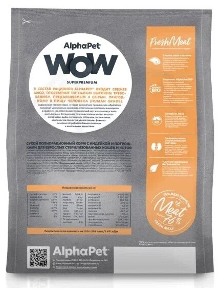 Сухой полнорационный корм с индейкой и потрошками для взрослых стерилизованных кошек и котов AlphaPet WOW Superpremium.Преимущества:76% мясного белка;Свежее мясо в составе;Низкое содержание жира и оптимальный уровень клетчатки помогают ограничивать набор избыточного веса;Баланс магния, кальция и фосфора для здоровья мочевыделительной системы;Уникальный комплекс натуральных добавок AlphaPetBIO;Натуральные ингредиенты;Не содержит ГМО, искусственных красителей и ароматизаторов;Ингредиенты, пригодные в пищу человеку, уровня Human Grade;Бережная технология, сохраняющая вкусовые и питательные свойства свежего мяса.