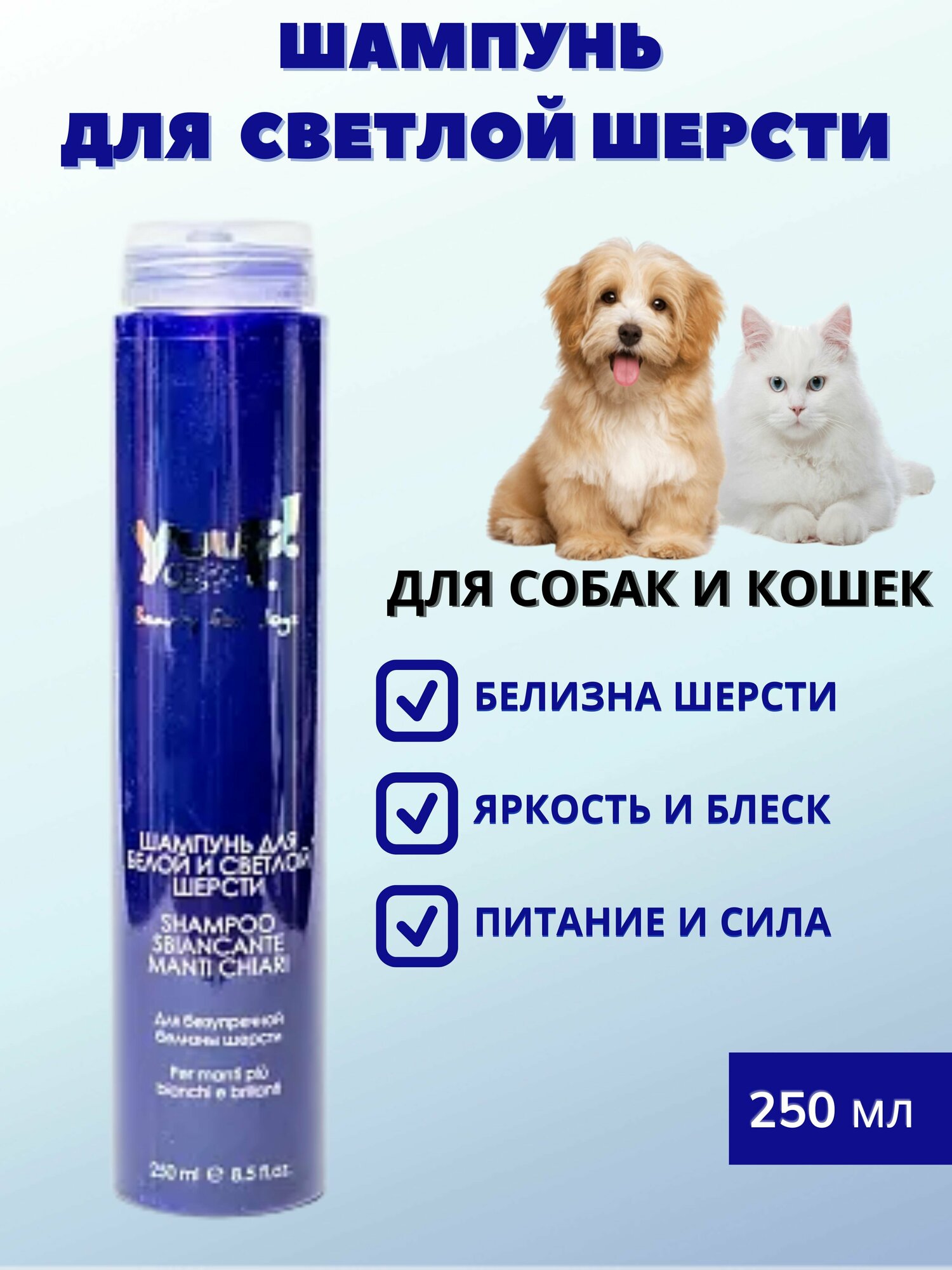 Шампунь для белой и светлой шерсти подходит для собак и кошек, создан профессиональным брендом косметики для животных из Италии специально для домашнего применения. Линия Yuup Home отличается качеством, сравнимым с профессиональной косметикой, применяемой в груминге, но при этом продукция более доступна, благодаря небольшим объемам упаковок и вы можете быть уверены в высоком качестве продукции.Преимущества:Подходит для собак и кошек всех пород, особенно для животных с белой или светлой шерстью. Подходит для собак всех пород с любым типом шерсти, а также кошек.Восстанавливает природную белизну шерсти и придает ей яркость и блеск, способОсобый пигмент в составе шампуня противодействует пожелтению с первого применения.Кератин, витамины С и Е, пантенол - укрепляют и оздоравливают шерсть и кожу питомца.Без парабенов, без фталатов.Экстракты бамбука, лотоса и семен льна осветляют и поддерживают цвет светлой шерсти собак и кошек.