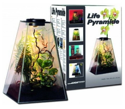 Флорариум-инсектариум в виде пирамиды с сенсорным освещением, свет галогенный белый, 30×30×30 см, высокая.Флорариум-инсектариум в форме пирамиды Lucky Reptile Life Pyramide подходит для небольших амфибий, скорпионов, пауков и насекомых. Создан из тонкого стекла и доступен в двух размерах с разными вариантами освещения. Ночное освещение, дневное и обогрев обеспечивается светильником Lucky Reptile Life Light Halogen, позволяющей вести наблюдение за обитателями и создать им благоприятные условия для развития. Ночное освещение включается автоматически, благодаря наличию сенсорных датчиков.В верхней части на крышке расположена вентиляционная зона. Если же в пирамиде планируется разместить животных, которым необходимо большее количество свежего воздуха, то можно установить дополнительный вентилятор.Модель может также использоваться для выращивания растений и обычного декора.Параметры:Размер 30×30×45 см, свет — белый.Комплектация:Пирамида-флорариум, светильник Lucky Reptile Life Light Halogen, лампа Halogen Sun LV Nano в комплект не входит.