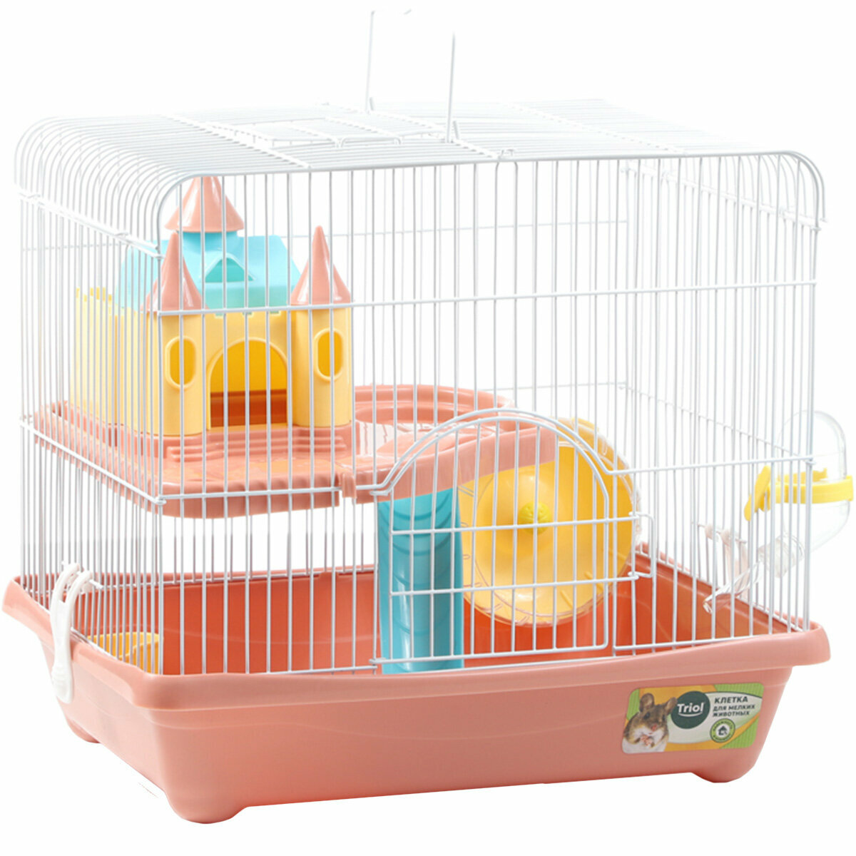 - В комплектацию изделия также входят: пластиковая миска, поилка с носиком, уютный домик в виде замка, горка и беговое колесо.