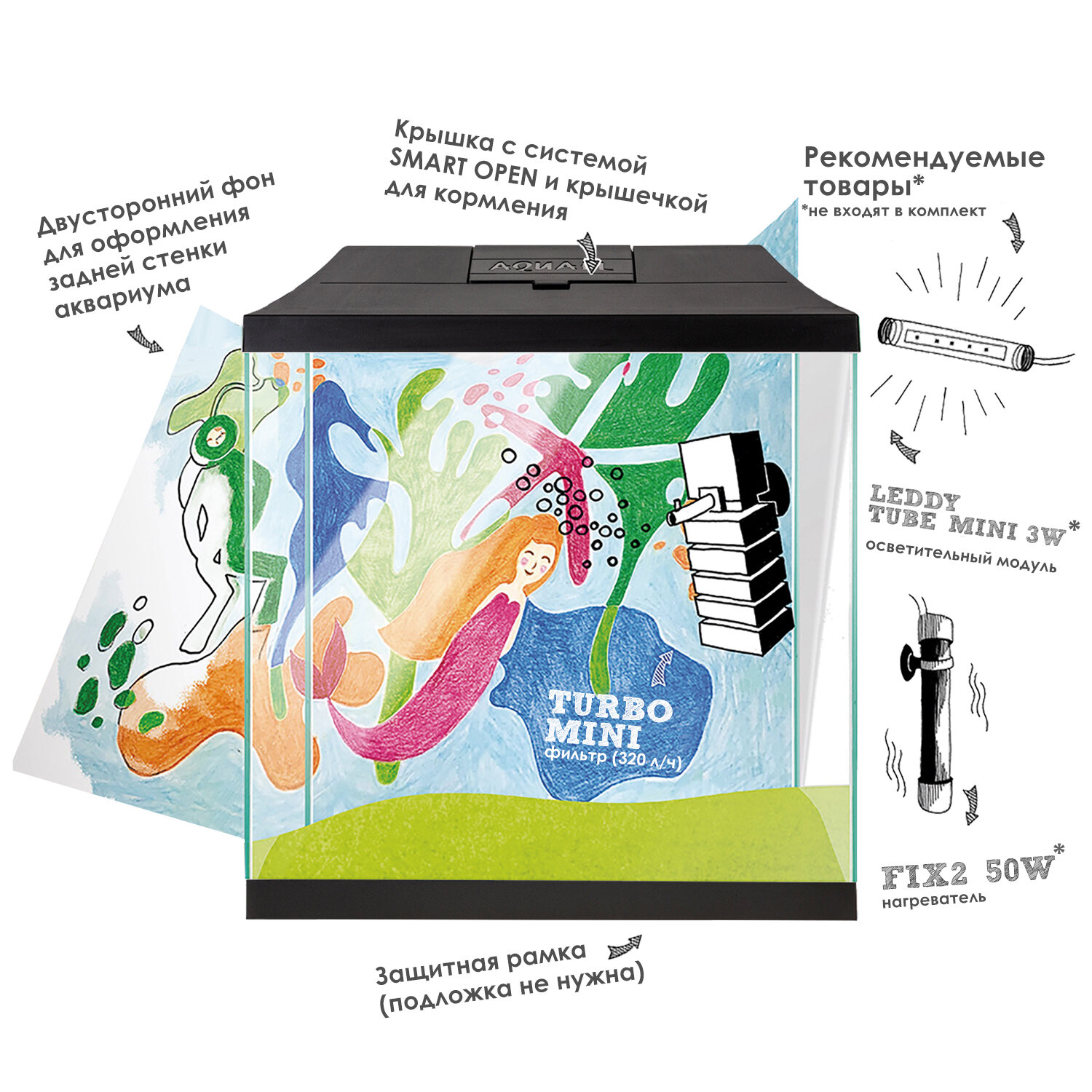 Стартовый набор для юного аквариумиста - Leddy Mini Creative Set от Aquael. Компактный аквариум - отличный вариант для размещения в детском пространстве. Параметры и комплект: Габариты (ДхГхВ): 28х15х30 Объём (л): 12,6 Фильтр внутренний: Turbo Mini Filter 320 литров в час Фон с принтом Рама для установки Особенности набора и установки: Компактность аквариума позволяет устанавливать его на рабочем столе и даже на подоконнике. Яркий фон с иллюстрациями юной художницы Анны Янкевич украсят подводный мир. Фон двусторонний, одна сторона которого свободна для самостоятельного декора. Ёмкость изготовлена из сверхпрозрачного стекла float. Для размещения аквариума теперь не нужен коврик, так как в набор включена отдельная прочная рама, обеспечивающая безопасную и надёжную установку. За фильтрацию отвечает входящий в набор внутренний фильтр Turbo Mini с внешней губкой. Такой фильтр прекрасно справляется с очисткой 12-литрового аквариума, идеален для мини систем, в том числе с маленькими рыбками или ракообразными.