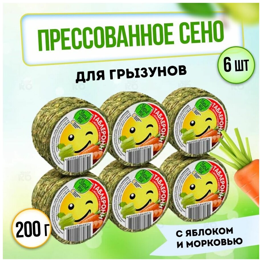 Прессованное сено луговое Зверье мое Таблеронн с яблоком и морковью - идеальный корм для грызунов. Преимущества: 100% натуральный состав, источник клетчатки, витаминов, минералов, благодаря форме может служить игрушкой для крупных питомцев, без пыли и опилок. Сено - обязательная составляющая рациона всех травоядных животных (кроликов, морских свинок, шиншилл, дегу и других). Важно обеспечить его постоянное наличие в клетке. Оно богато грубой клетчаткой, столь необходимой для здоровья зубов и оптимального пищеварения питомцев. Полезные свойства яблока и моркови для питомца: витаминизирует - обогащено каротином, калием, витаминов С; укрепляет иммунитет, повышает жизненный тонус; стимулирует процессы регенерации. Также сено для грызунов служит прекрасной подстилкой и развлечением, животные могут зарываться в сухой траве и строить гнезда. Хранить в сухом месте. Избегать продолжительного воздействия прямых солнечных лучей. Товары для животных / корм для кроликов/ корм для морских свинок / сено для кролика / сено для шиншилл / наполнитель в клетку для грызунов - 200 г x 6 упаковок