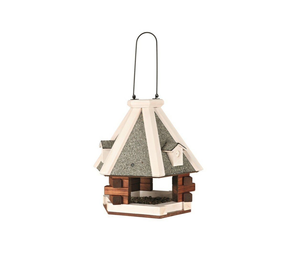 Подвесная деревянная кормушка для птицСтильная подвесная кормушка для диких птиц. Дизайн стилизован под деревянную беседку. Крыша кормушки покрыта минеральной крошкой, выступает за пределы основания, защищая корм от осадков, в том числе и снега в зимний период. Под крышей большая посадочная площадка для птичек. Размеры: ø 36 х 35 см, вес: 3,1 кг.Материал - покрытая безопасным прозрачным лаком натуральная сосна, пропитанная защитным составом. Кормушка подвешивается за специальную металлическую петельку.