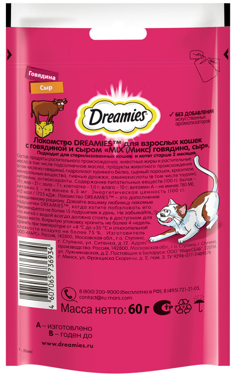 Модель: Лакомство Dreamies MIX с говядиной и сыром для кошек 6 штук по 60 г