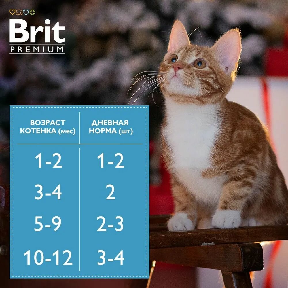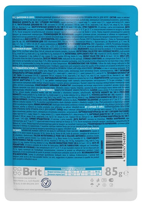Полнорационный влажный корм премиум класса для котят с цыпленком в соусе. Нежные кусочки цыпленка в ароматном соусе - идеальное сочетание для полноценного и сбалансированного рациона. Паучи Brit Premium однозначно заинтересуют вашу кошку и станут для нее любимым блюдом. Влажный корм содержит все необходимые витамины и минералы, которые необходимы котенку. Таурин в составе – важный ингредиенты для поддержания остроты зрения и здоровья сердечно-сосудистой системы кошек. Паучи отлично дополнят полнорационный сухой корм Brit Premium и внесут разнообразие в питание Вашей кошки.рекомендации ПО кормлению: следуйте суточным дозам, указанным в таблице по кормлению. У животного всегда должен быть доступ к свежей питьевой воде.условия хранения: при температуре от 0 °С до 25 °С и относительной влажности воздуха не более 75 %. После вскрытия потребительской упаковки продукт хранить в холодильнике не более 2 суток. Перед подачей рекомендуется довести продукт до комнатной температуры.энергетическая ценность на 100 Г: 82 ккал / 343 кДж.