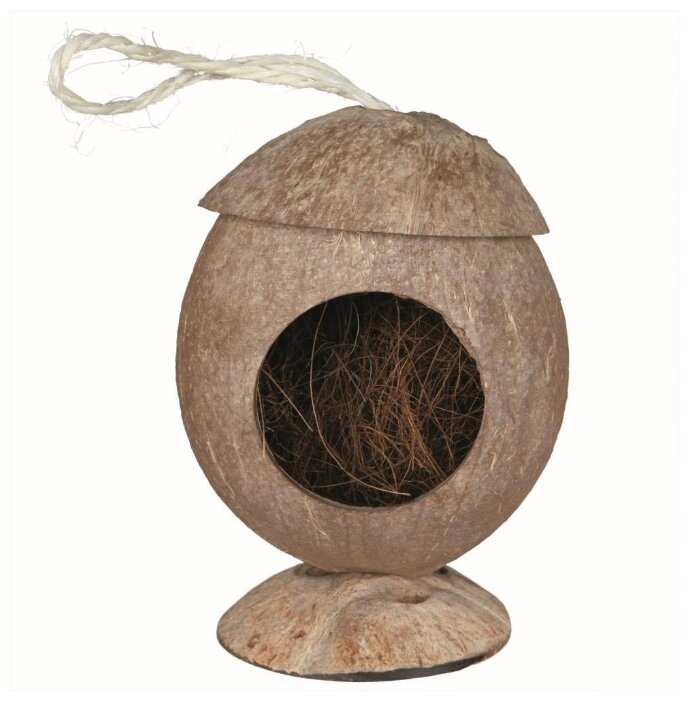 Оригинальный подвесной домик для клеток с грызунами. Подходит для хомячков, декоративных мышей и других питомцев схожих по размерам. Домик имеет круглый фронтальный вход и наполнен натуральным кокосовым волокном. Материал домика для хомячков - цельный кокосовый орех с обработанной поверхностью. Подвешивается за веревку и надежно фиксируется стальным карабином с резьбой.