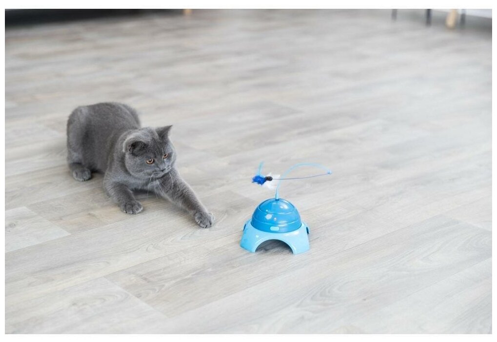 Электронная игрушка для кошки, которая представляет собой вращающуюся во все стороны удочку-дразнилку с перышками, которая расположена на подставке с вращающим механизмом. Управлять скоростью вращения можно дистанционно при помощи пульта. Питание - 3 батарейки типа АА (в комплект не входят). Материал основания и пульта ДУ - прочный безопасный пластик. В комплект входит запасная удочка-дразнилка с перышками.