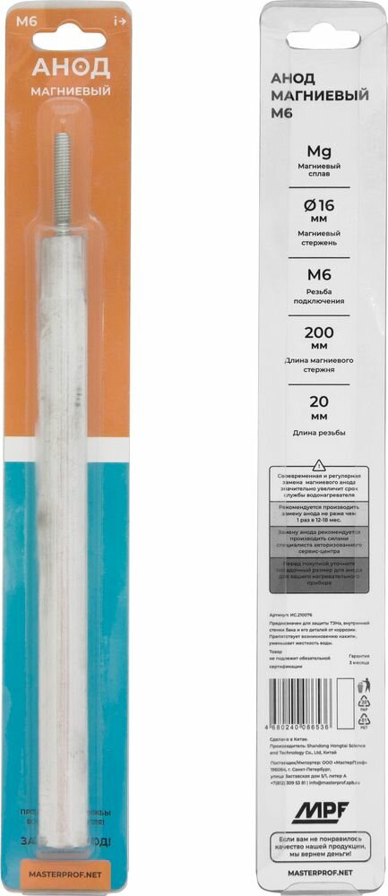 анод магниевый MPF М6 d16/200 мм дл. шп. 20 мм (ИС.210076)