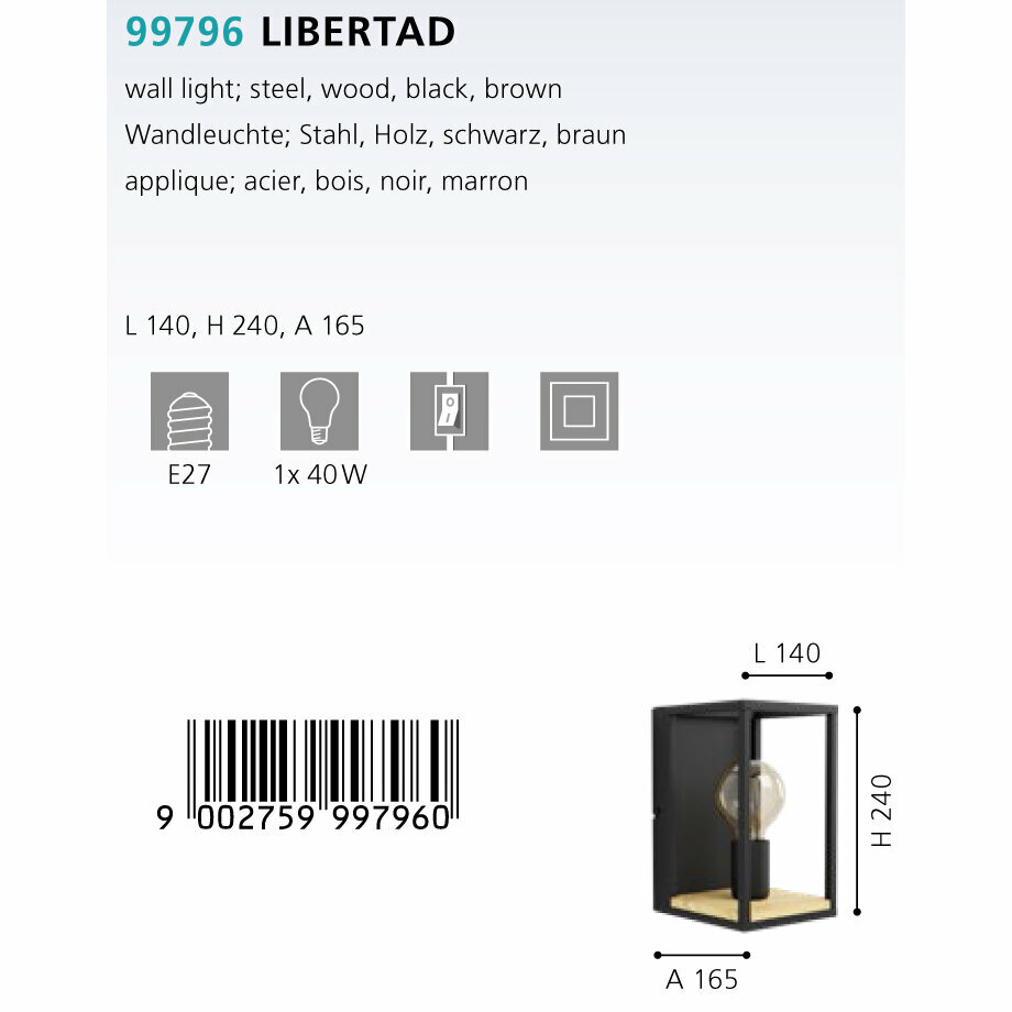 | Номенклатура | 99796 Бра LIBERTAD, 1Х40W, E27, L140, H240, A165, сталь/дерево, черный/коричневый |