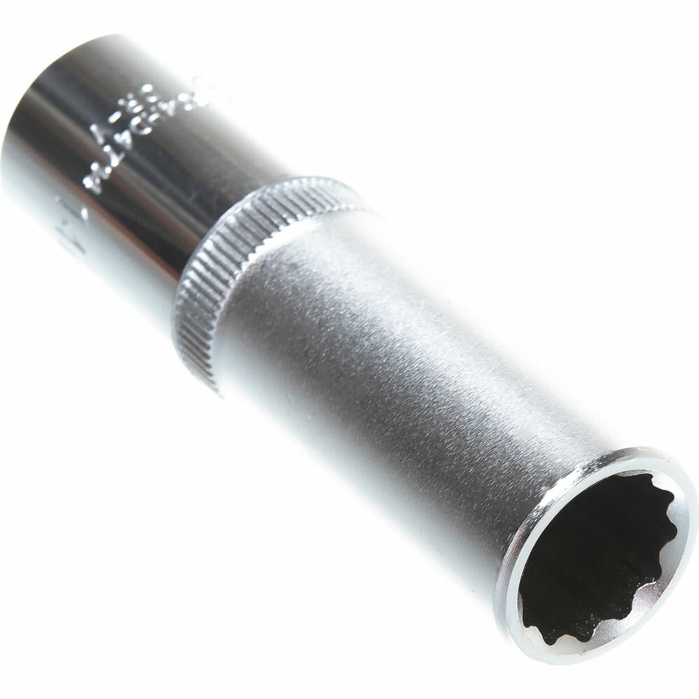 Основная разновидность рабочих насадок сборного слесарно-монтажного инструмента - это торцевая головка. Торцевые головки разделяются по геометрии рабочего профиля, по длине и по назначению. Такие инструменты обеспечивают наилучшие условия для приложения рабочего усилия по сравнению с другими видами инструмента для работы с внешними рабочими профилями. Двенадцатигранные головки удобнее в применении по сравнению с 6-гранным, так как какой профиль предоставляет большую свободу для позиционирования головки на крепеже. Однако, он обладает меньшим по площади пятном контакта и воздействие на крепеж, особенно с высокой нагрузкой, может повредить грани крепежной детали, что в сочетании с большим количеством концентраторов напряжения несколько ограничивает применяемые максимально допустимые нагрузки, опять же, по сравнению с 6-гранными головками. Двенадцатигранная торцевая головка увеличенной длины. Применяется при работе с крепежом на относительно высоких шпильках и заглубленных деталях. Торцевая головка выполнена из хромованадиевой стали, имеет накатку и полуматовое хромоникелевое покрытие. Изделие изготовлено по стандарту DIN 3124, полностью соответствует требованиям ГОСТа 25604-83.