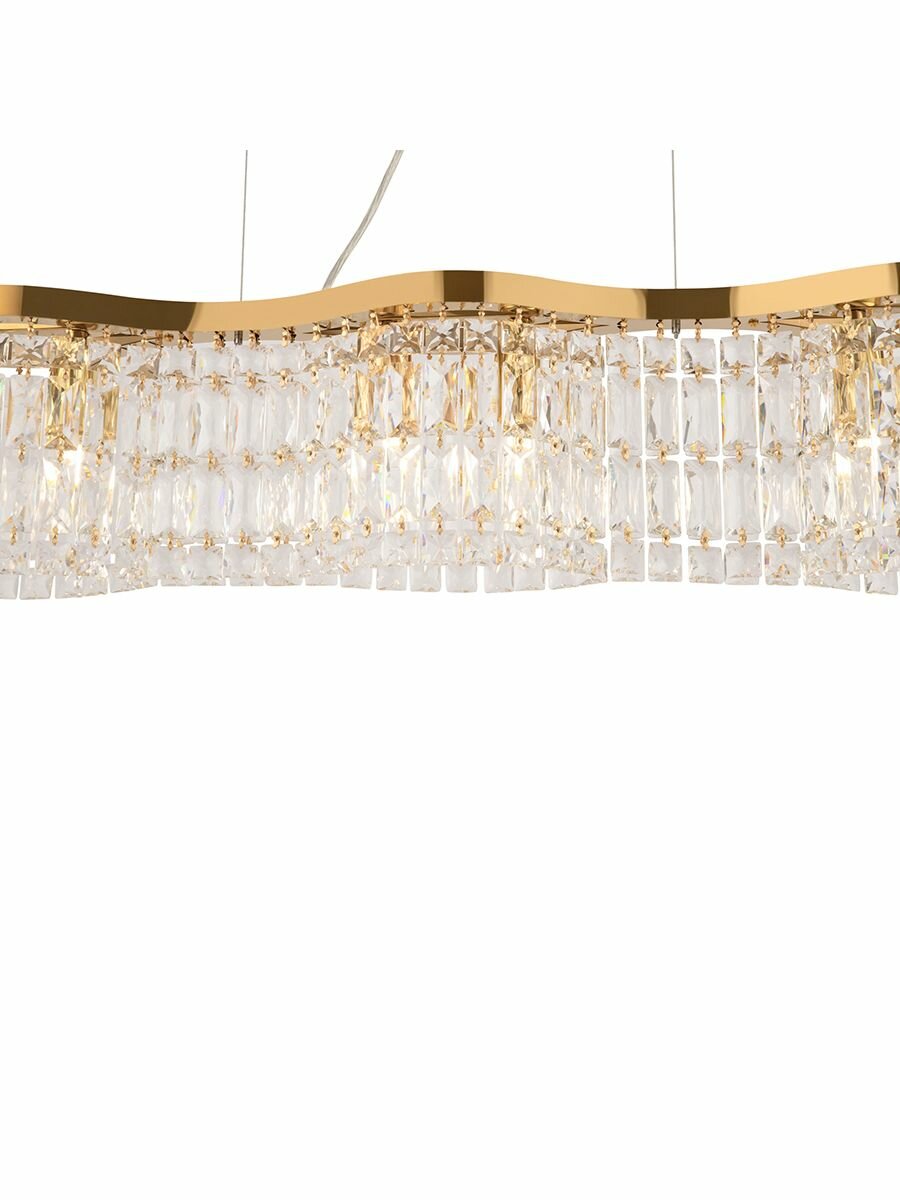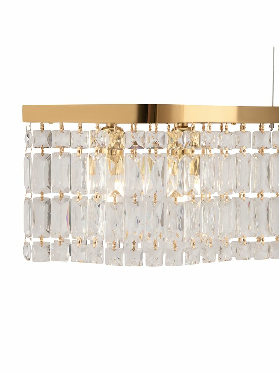 Кристаллы различных форм плотным занавесом свисают с фигурного основания, наполняя интерьер атмосферой роскоши. Арматура светильников изготовлена из хромированного металла, который отражает свет ламп.
