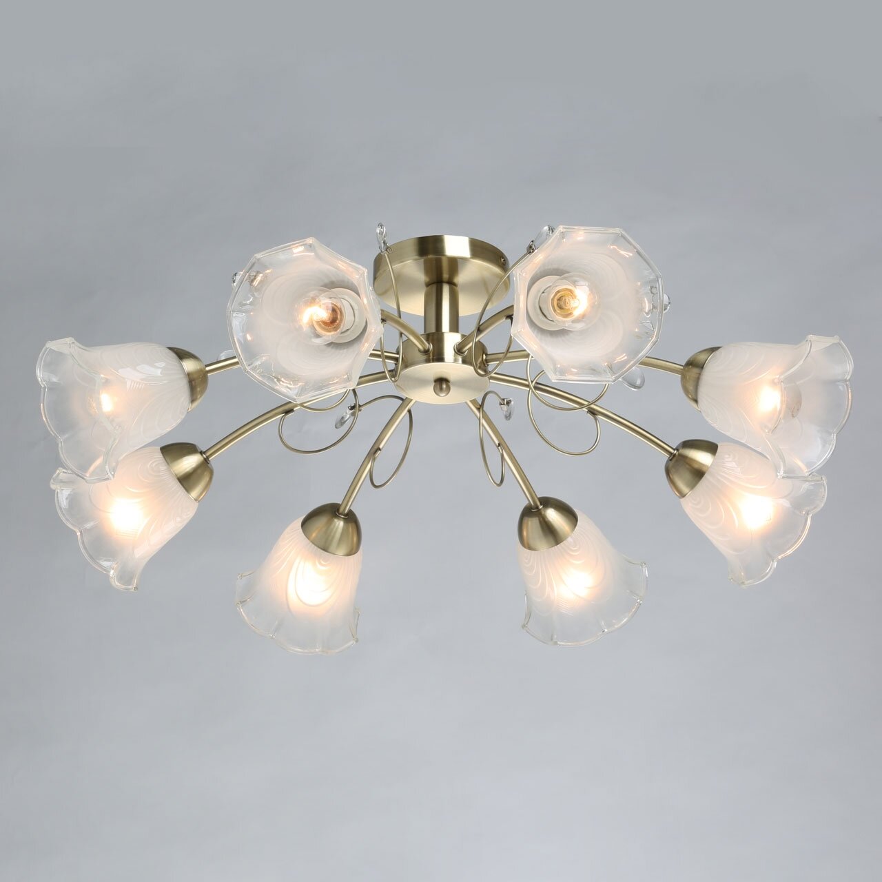 Металлическое основание потолочного светильника гальванизировано в цвет античной бронзы. Стеклянные плафоны отлиты в сложную форму и матированы. Светильник декорирован хрустальным стеклом миндальной формы.