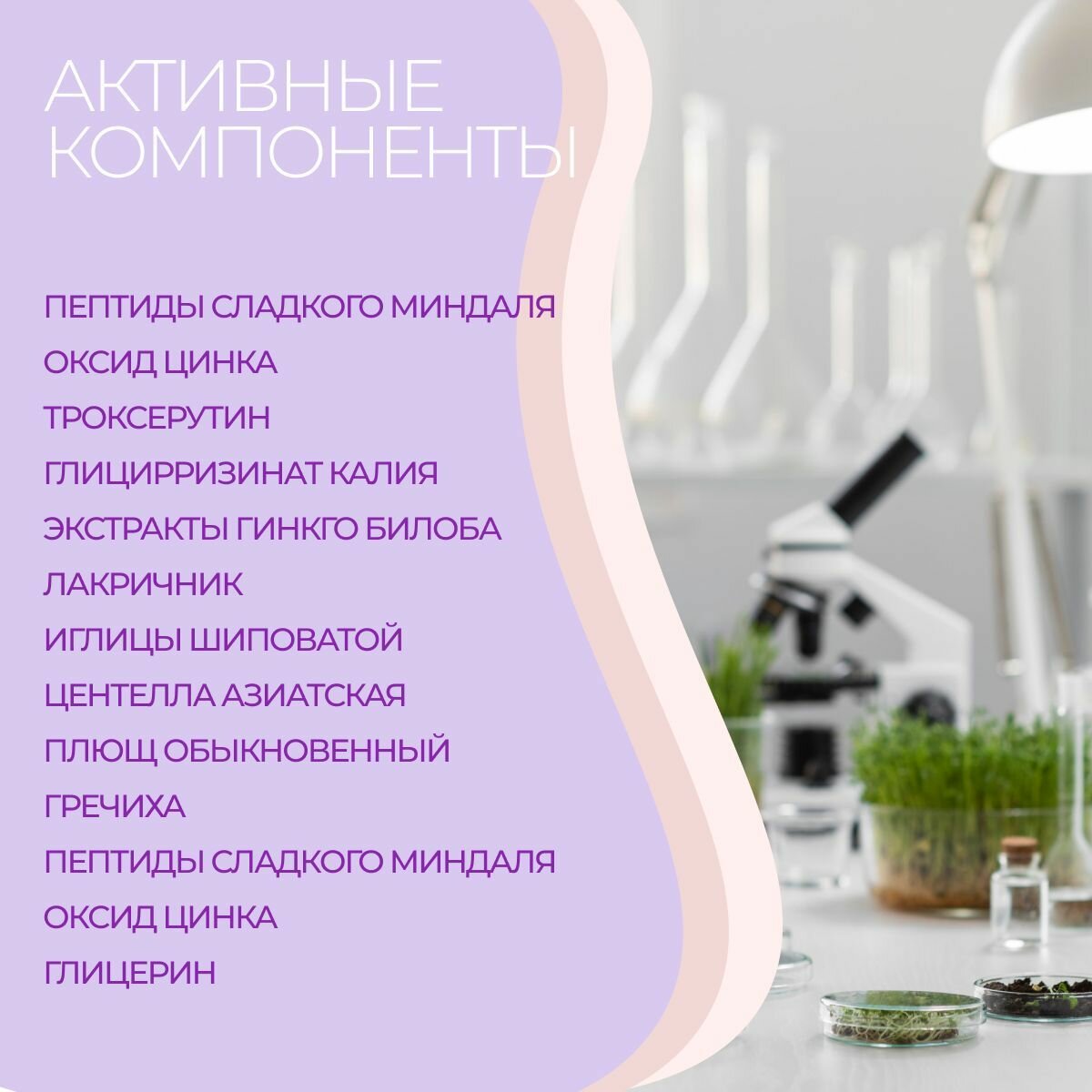 Активные ингредиенты: DMAE, масло ши, априлозу абрикосовых косточек, экстракт морских водорослей Nannochloropsis oculata, пептиды сладкого миндаля (Sweet Almond), экстракт сычуаньского перца (Zanthoxylum Peperitum Ext.), дигидрокверцетин (Dihydroquercetin).