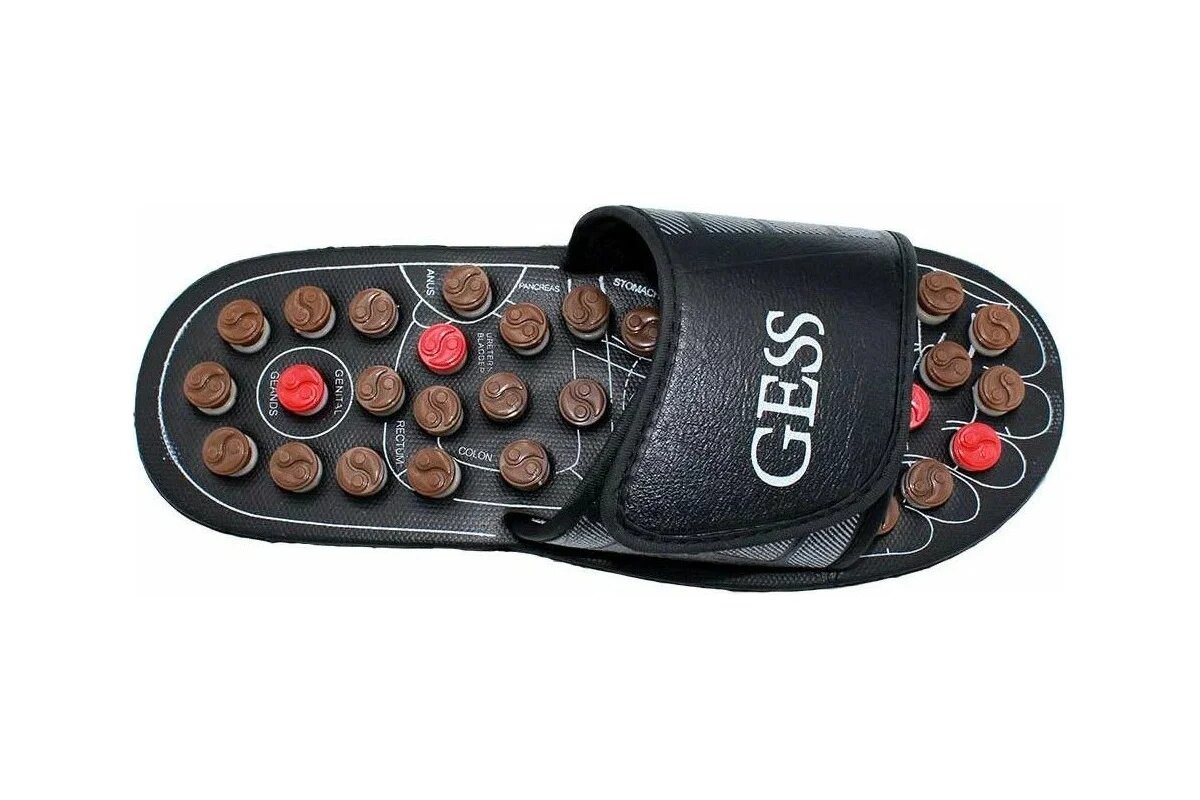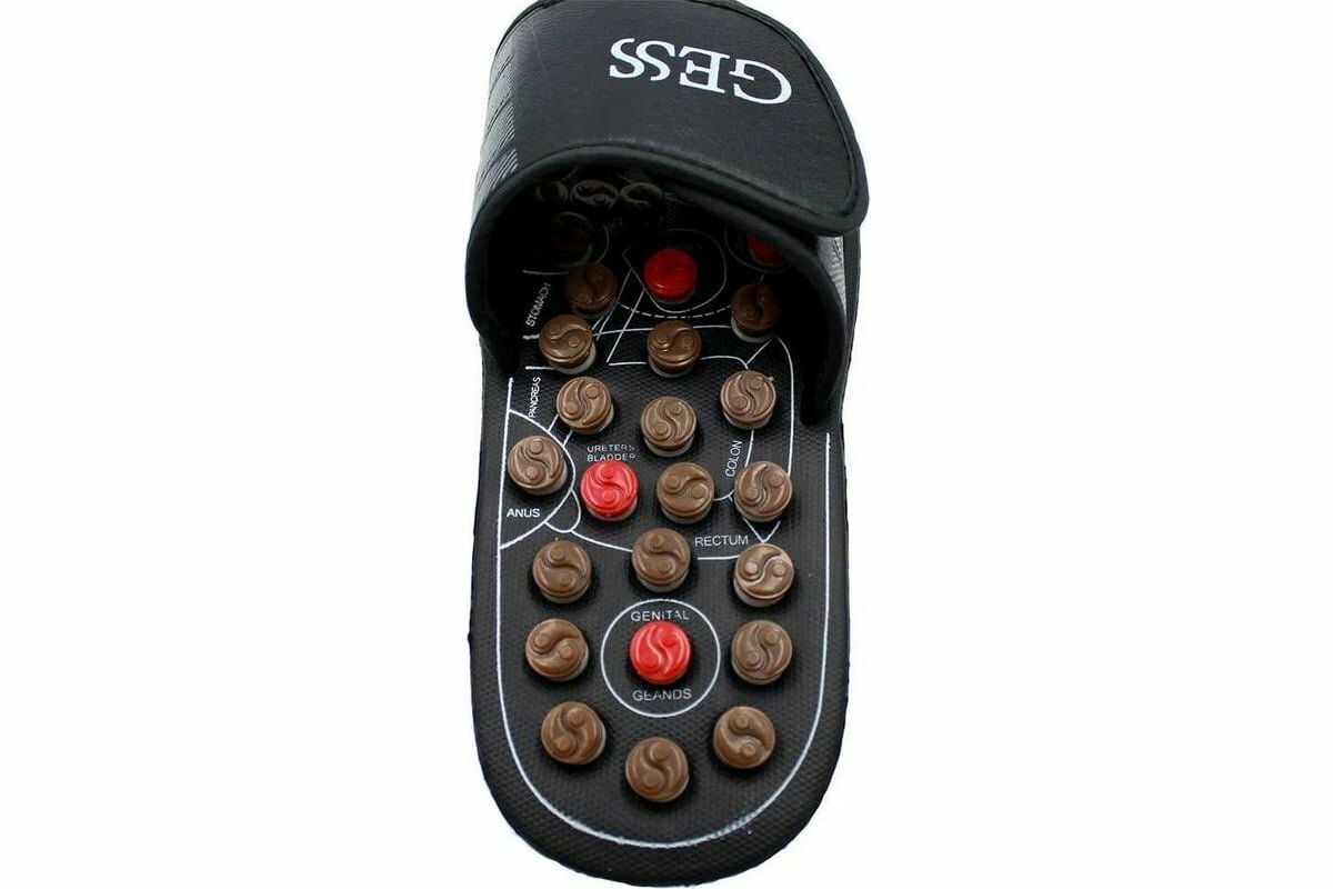 Массажер в виде тапочек для акупунктурного воздействия на стопы. Массаж осуществляется пружинящими кнопками, которые при надавливании проворачиваются и массируют определённую точку.