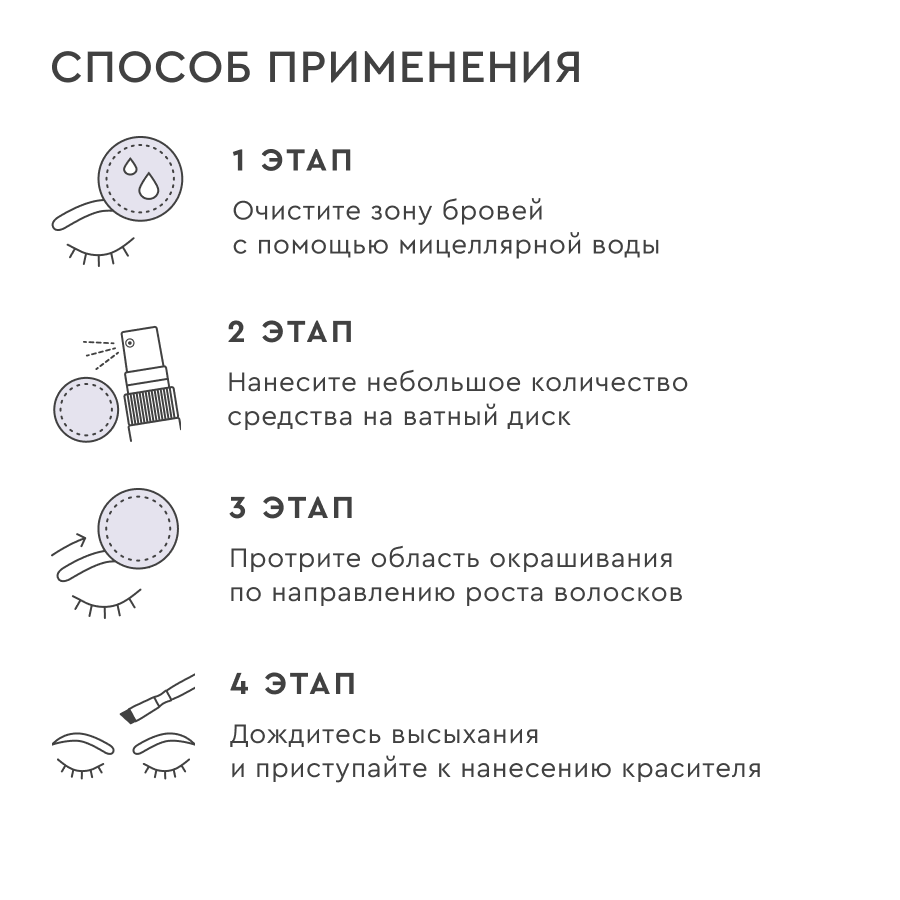 | Способ применения | Предварительно очистите зону бровей от макияжа и возможных загрязнений с помощью мицеллярной воды. Нанесите небольшое количество средства на ватный диск, тщательно протрите область окрашивания по направлению роста волосков. Дождитесь высыхания и приступайте к нанесению красителя. |
