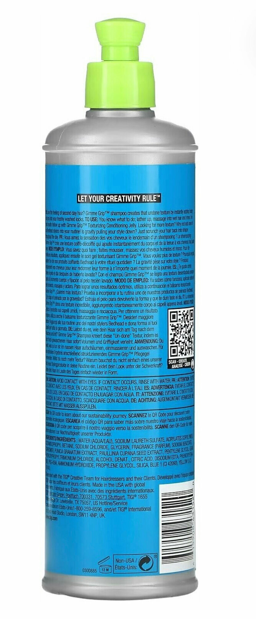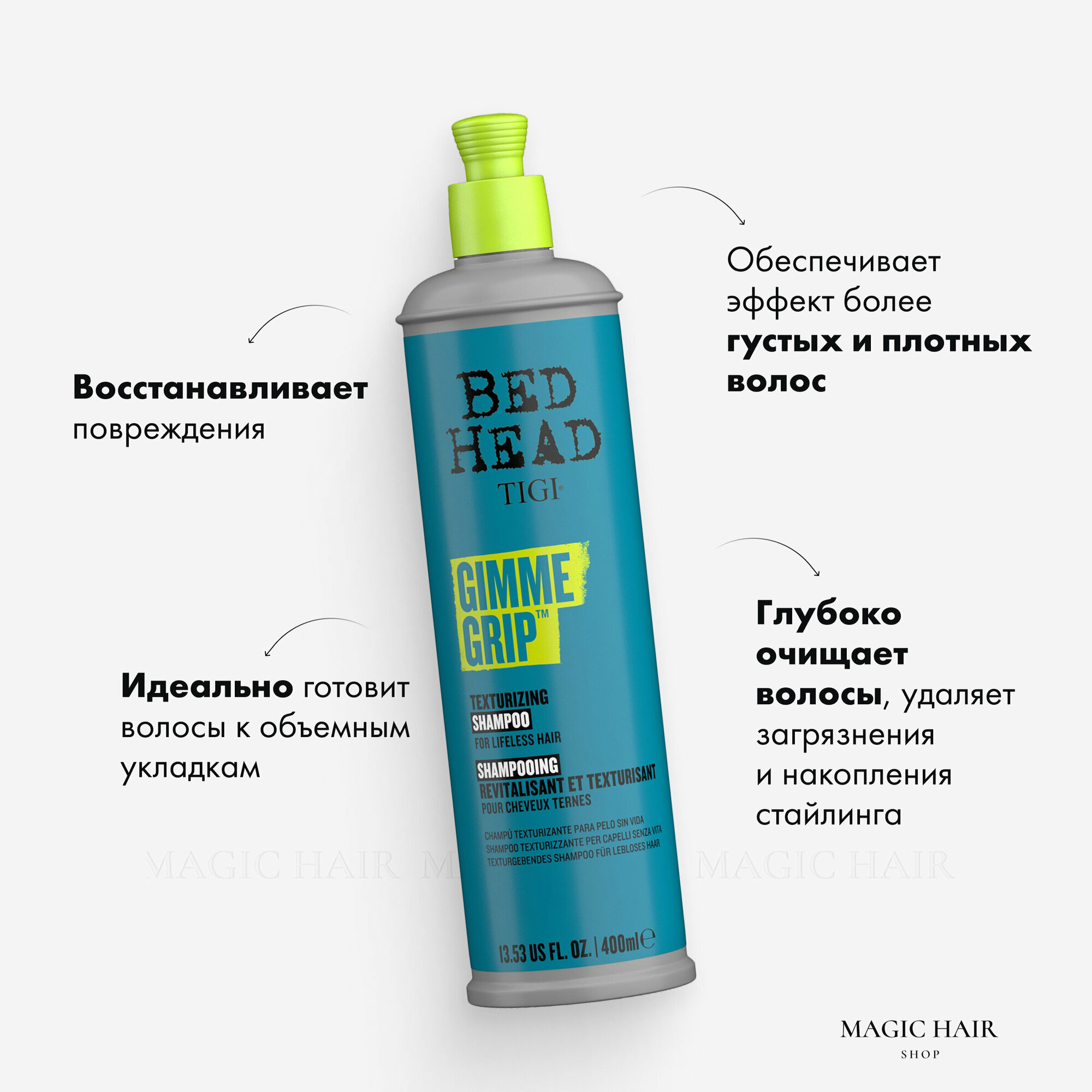 Шампунь текстурирующий для волос Bed Head Fully Loaded Gimme Grip. Любишь небрежный стайлинг? Шампунь создает ту самую ненавязчивую текстуру, при этом делая волосы объемными и плотными. Позволить создать небрежную текстуру, придаст волосам объем и плотность. Глубоко очищает волосы от загрязнений, снимает накопления стайлинга на волосах, делает их легкими и свежими. Твои волосы готовы к самым объемным укладкам! Идеально сработает даже на тонких волосах.