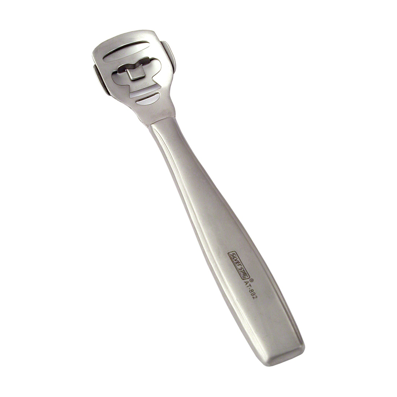 Скребок для пяток, цельнометаллический, сталь коррозионно-стойкая жаропрочная, твердость 46-48 HRC для профессионального использования.