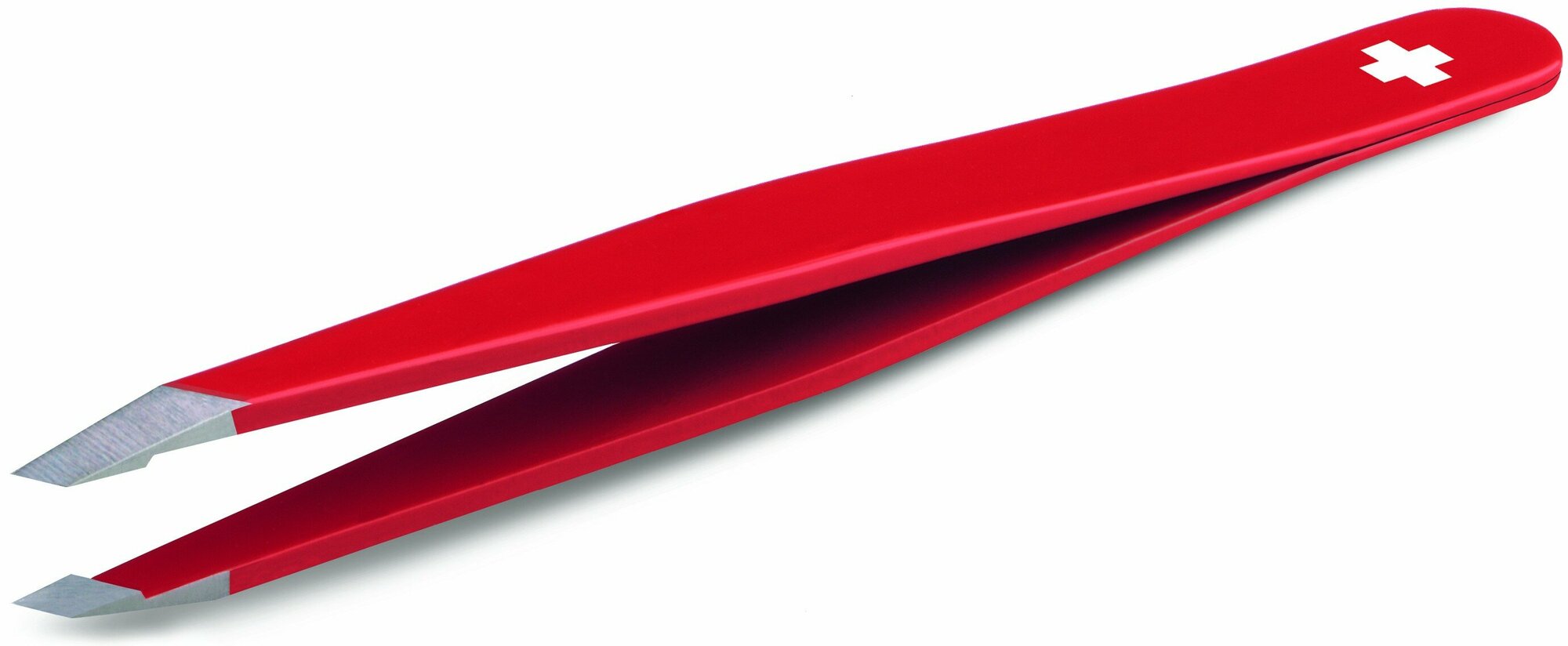 Пинцет для бровей со скошенным кончиком, покрытый краской. На этом пинцете изображен швейцарский крест. Модель Классик - это высококачественный косметический пинцет, разработанный для максимально удобного и точного использования. Скошенные кончики идеальны для выщипывания бровей или удаления нежелательных волосков с любых других частей лица и тела. Пинцеты Rubis обеспечивают надежный захват волоска и его быстрое и аккуратное удаление. Идеальное смыкание кончиков, их тонкость и точность, а также идеальная жесткость, которая позволяет не перенапрягать руку при работе.