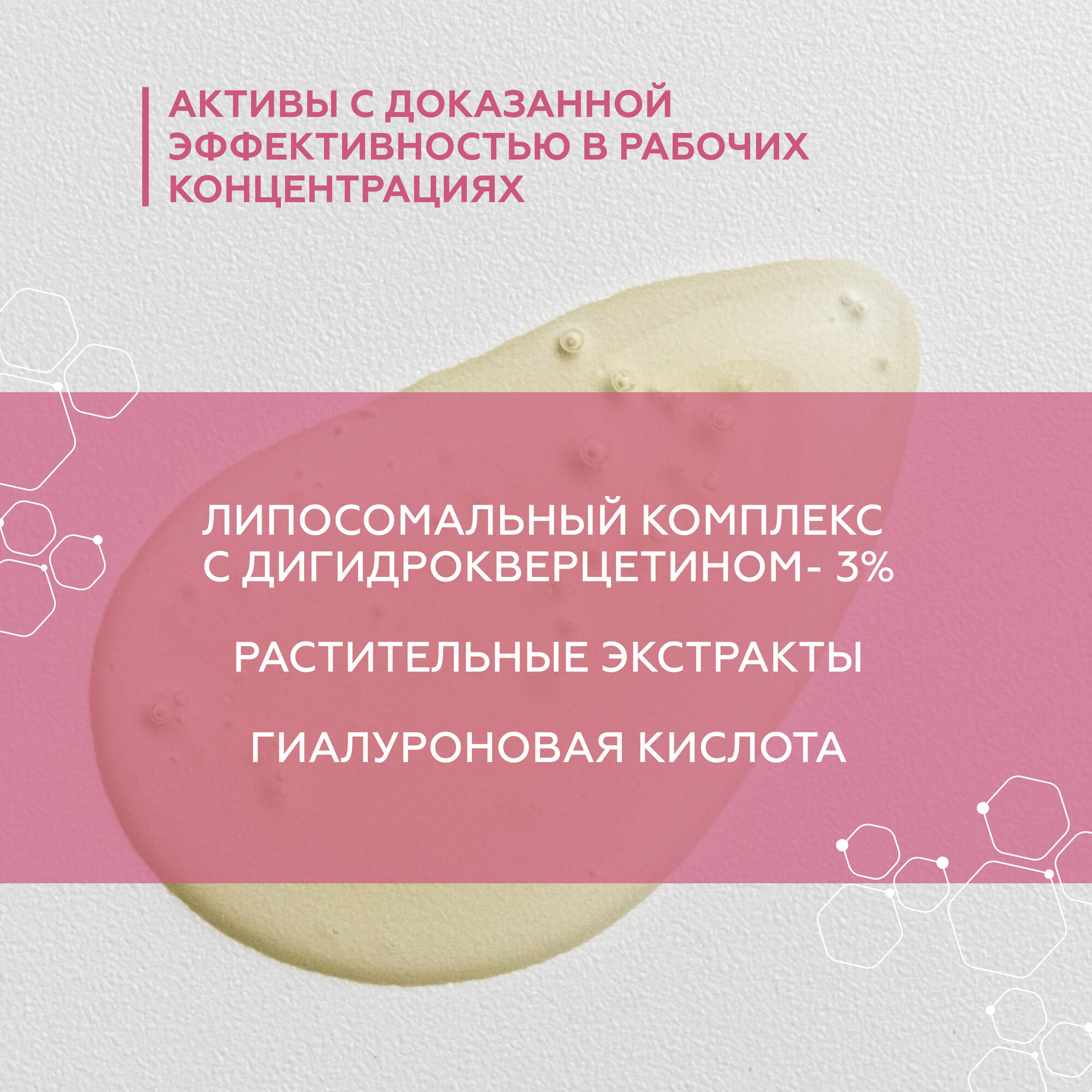 Состав: вода очищенная, фосфолипидный комплекс дигидрокверцетином, глицерин, олигосахариды и камедь цезальпинии шиповатой, пропиленгликоль, экстракты: плюща, арники, бузины, мальвы, липы, огурца, постенницы; гиалуроновая кислота, карбомер нейтрализованный, аристофлекс, метилпарабен, пропилпарабен, превентол, дисодиум ЭДТА, отдушка, краситель пищевой.