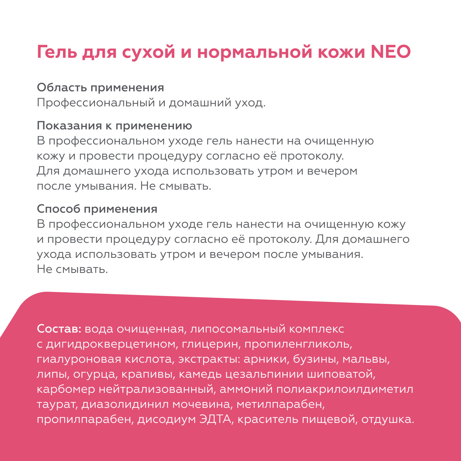 | Способ применения | нанести гель на очищенную кожу или электрод/манипулу (в зависимости от методики) и провести процедуру согласно инструкции к аппарату или протоколу процедуры. При ионофорезе гель вводится с положительного полюса. Для домашнего ухода использовать ежедневно утром и вечером после умывания. Можно не смывать |