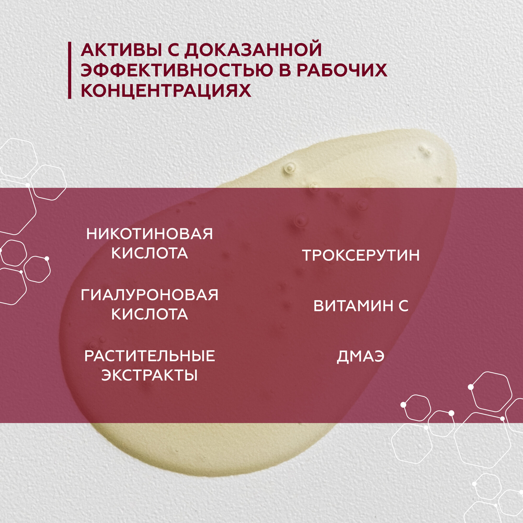 Состав: вода очищенная, экстракты: конского каштана, иглицы, центеллы азиатской, виноградных листьев, ивы, гречихи; глицерин, пропиленгликоль, троксерутин, гиалуроновая кислота, витамины: РР, С; карбрмер нейтрализованный, аристофлекс, жермабен, дисодиум ЭДТА, отдушка.
