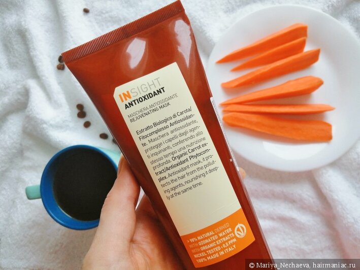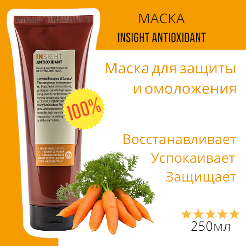 Маска антиоксидант для перегруженных волос ANTIOXIDANT — омолаживающая маска укрепляет волосы по всей длине. Защищает от воздействия свободных радикалов. Обладает реструктурирующим, увлажняющим и тонизирующим свойствами. В составе органический экстракт моркови,масло жожоба, соевое масло, масло лесного ореха.