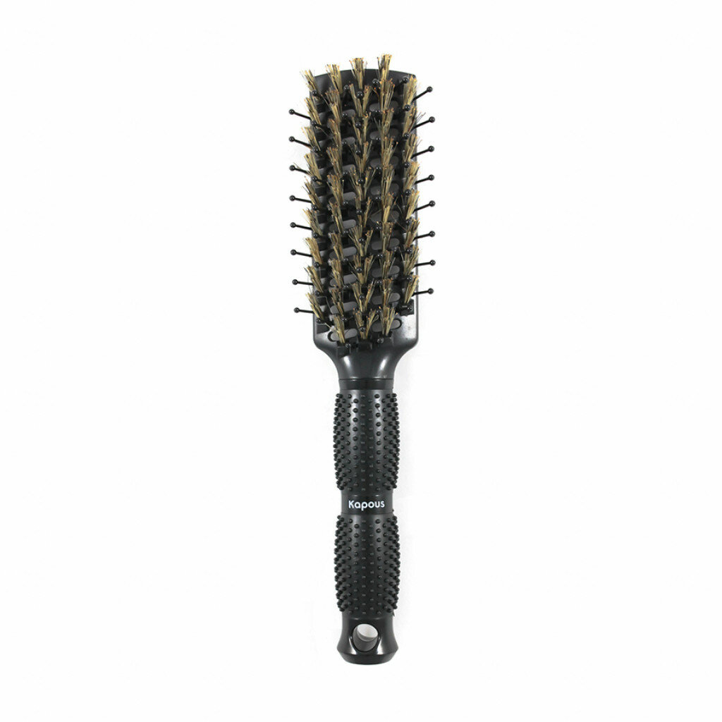 Щетка плоская продувная для волос Ультра блеск Kapous Professional лёгкая и комфортная щетка на термостойкой пластиковой основе облегчает процесс укладки волос и экономит время при работе. Гибкие штифты с закругленными кончиками из высококачественного термостойкого ионного нейлона обеспечивают максимальный захват и контроль над волосами во время работы, а натуральная щетина, расположенная под углом к основанию, обеспечивает исключительное «выглаживание» волос, делает их шелковистыми и блестящими. Сквозные отверстия в корпусе щетки продуваются воздухом фена, что обеспечивает быстрое высыхание волос и фиксирует результат. Удобная прорезиненная ручка со специальным рельефным покрытием предотвращает скольжение. Щетка помогает выполнить классическую укладку, выпрямляет волосы, создает прикорневой объём и объем по длине.