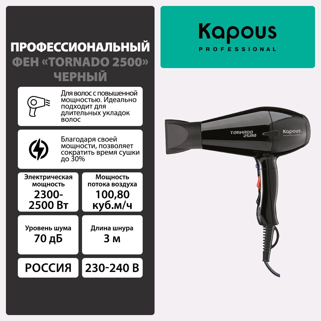 Профессиональный фен с повышенной мощностью, модель Tornado-2500 Kapous Professional. Идеально подходит для длительных и сложных укладок волос. Благодаря своей мощности и распределению воздушного потока, позволяет сократить время сушки до 30%. Эргономичная ручка и переднее расположение кнопок для регулировки позволяет работать как левой, так и правой рукой. Вес, мощность и малошумность фена обеспечивает комфортное выполнение укладок волос.