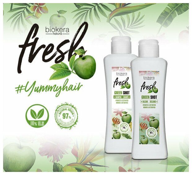 Бальзам Green Shot Biokera увлажняет и выводит токсины благодаря своей формуле, содержащей до 97% натуральных компонентов, придает волосам мягкость. Детоксифицирующий веганский бальзам борется с ежедневным стрессом и делает волосы более увлажненными и естественными, придает им жизненную силу и свежесть. Обладает потрясающим яблочным ароматом.