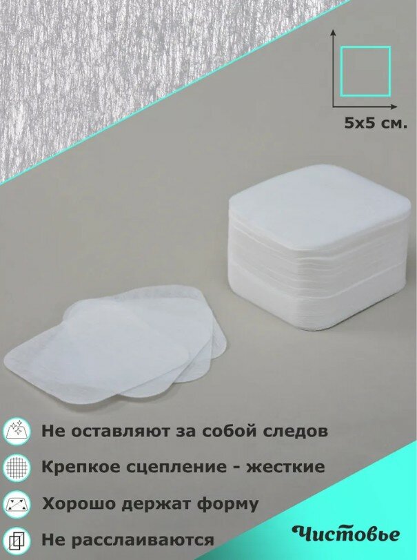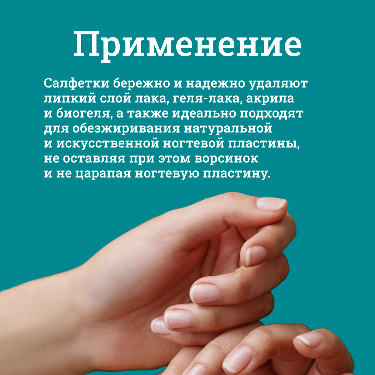 Салфетки спанлейс 5 х 5 см, безворсовые жесткие бережно и надежно удаляют липкий слой, лака, геля-лака, акрила и биогеля, а также идеально подходят для обезжиривания натуральной и искусственной ногтевой пластины, не оставляя при этом ворсинок и не царапая ногтевую пластину. Салфетки не расслаиваются, не оставляют за собой следов, хорошо держат форму.