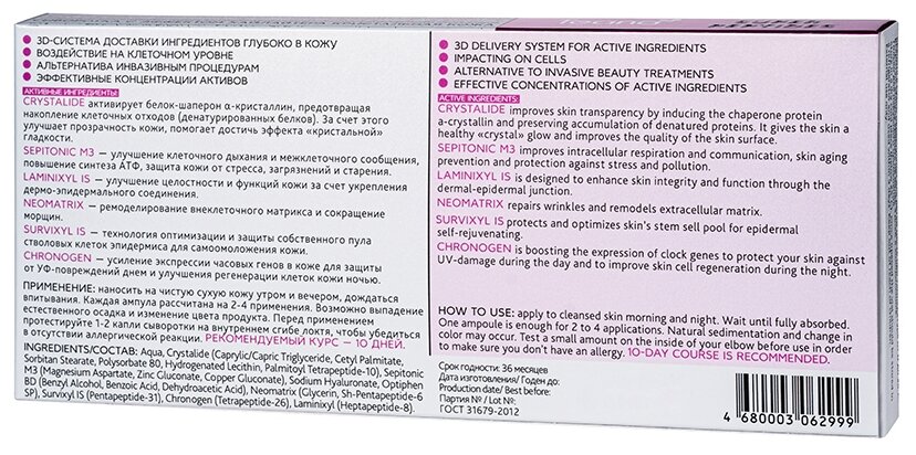 | Состав | Aqua, Crystalide (Caprylic/Capric Triglyceride, Cetyl Palmitate, Sorbitan Stearate, Polysorbate 80, Hydrogenated Lecithin, Palmitoyl Tetrapeptide-10), Sepitonic M3 (Magnesium Aspartate, Zinc Gluconate, Copper Gluconate), Sodium Hyaluronate, Optiphen BD (Benzyl Alcohol, Benzoic Acid, Dehydroacetic Acid), Neomatrix (Glycerin, Sh-Pentapeptide-6 SP), Survixyl IS (Pentapeptide-31), Chronogen (Tetrapeptide-26), Laminixyl (Heptapeptide-8) |