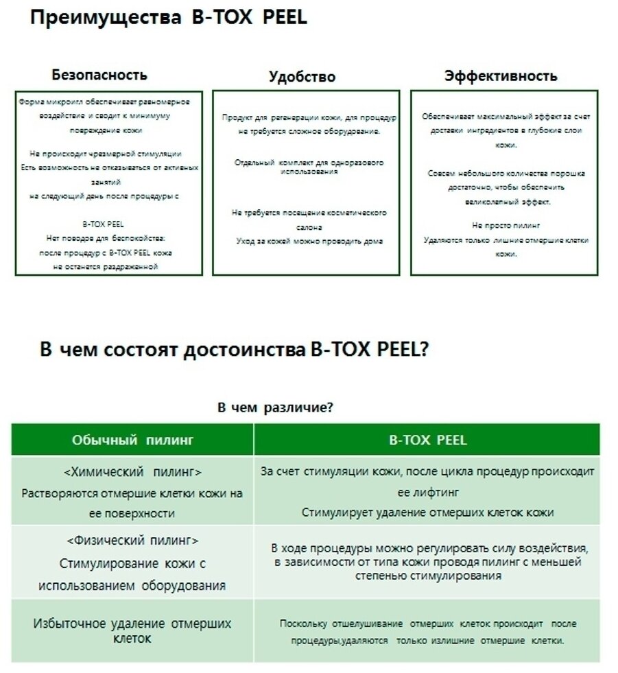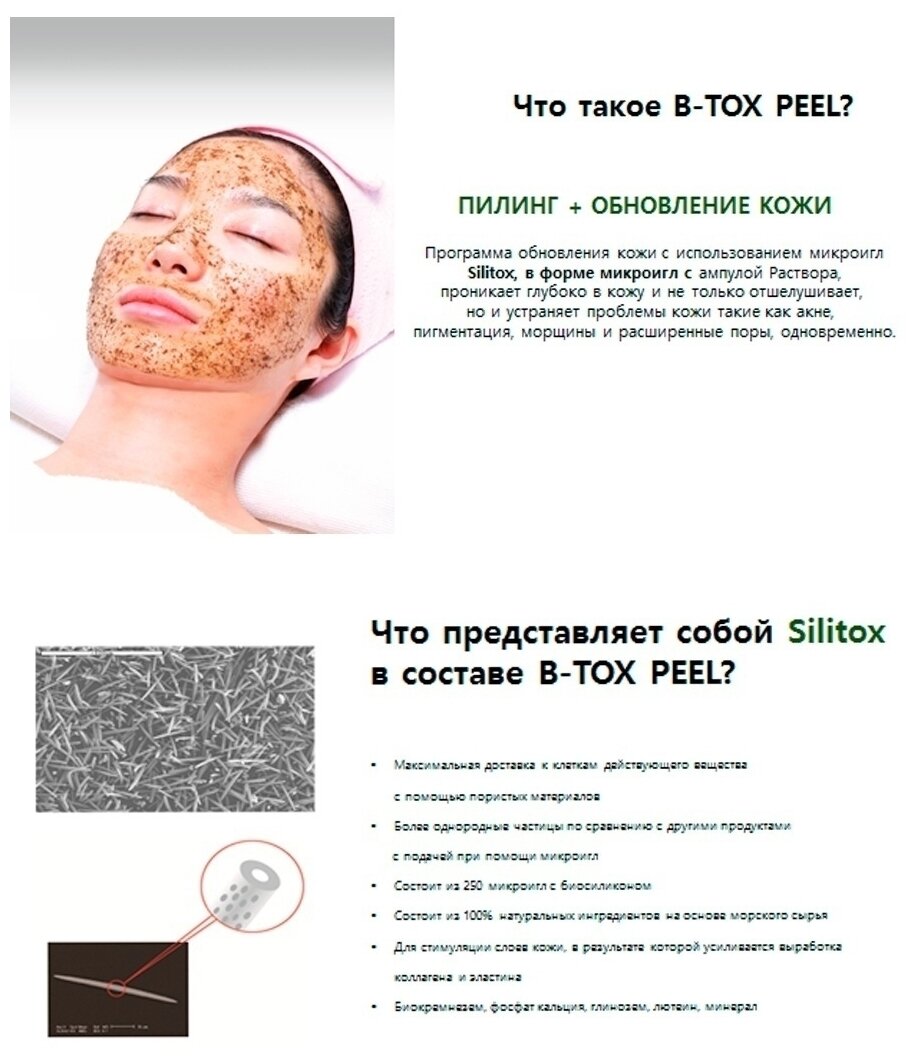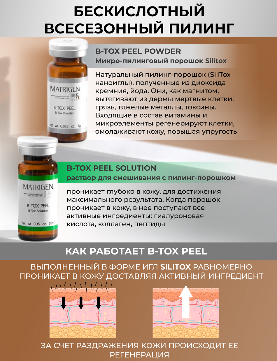 Пилинг система обновления кожи Matrigen B-TOX PEEL Skin Renewal System - набор ампульных средств для регенерации клеток, которые стимулируют образование коллагена и эластина. Безинъекционный процесс применения. Программа пилинга состоит из: B-Tox PEEL Рowder – натуральный пилинг-порошок на основе глубоководного кремнезема. Он проникает глубоко в дерму, поглощает токсины, после чего выводит из организма с помощью механизмов циркуляции кожи. B-Tox PEEL Solution – раствор для смешивания с пилинг-порошком, проникает глубоко в кожу, для достижения максимального результата. B-TOX PEEL – это инновационный нехимический пилинг. Его эффективность подтверждена в ходе клинических тестов. Является многообещающей новинкой эстетической медицины. Не подходит для самостоятельного применения. Используется исключительно в ходе профессиональных косметологических манипуляций. Matrigen B-TOX PEEL – трехмерный имплантат омолаживающего действия с нано микро морскими иглами. Терапевтический эффект 3D-средства достигается за счет кремний-органических биологически доступных соединений. Источником сырья является океаническая органика редких видов. В качестве «инструмента» выступает микроигла SiliTox природного происхождения с сечением 250 nm. Обработка кожи происходит фракционным способом – согласно заранее заданной точечной сетке. Действие пилинга B-TOX PEEL начинается непосредственно после процедуры. За 48-52 часа происходит рассасывание введенных игл SiliTox. Имплантаты растворяются в слое эпидермиса. В результате воздействия происходит естественная детоксикация кожных покровов. Параллельно – уплотнение кожи, клеточное деление и осветление пигментации. Поры освобождаются от скоплений отмершей ткани, запускается процесс регенерации. B-TOX PEEL не имеет строгих противопоказаний и подходит любому типу кожи независимо от возраста пациента. Пилинг обладает глубоким действием, поэтому способен справиться с широким спектром дерматологических проблем. B-TOX PEEL обеспечивает: естественное очищение кожи от токсинов;