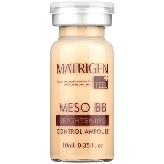 Сыворотка Matrigen Meso BB Brightening Control System – профессиональный препарат для проведения процедуры bb glow. Скрывает возрастные несовершенства, увлажняет кожу, выравнивает цвет, создаёт эффект тонального крема на год. Выпускается в одном тоне, подходит всем типам и оттенкам кожи. Показания к применению: создание эффекта легкого BB-крема, выравнивание тона кожи, осветление пигментации, веснушек, застойных пятен от акне. Диоксид титана осветляет кожу, оберегает от воздействия УФ-лучей, используют как загуститель. Не вступает в реакцию с кожей, потому гипоаллергенный. Аллантоин препятствует образованию морщин, разглаживает имеющиеся, благодаря ранозаживляющим свойствам регенерирует кожу, придаёт мягкость. Витамин Е препятствует старению кожи, сохраняет ее красоту, подтягивает контур, выполняя функцию лифтинга, устраняет пигментные пятна, веснушки, рубцы. Алоэ вера увлажняет и успокаивает кожу, убирает покраснения, высыпания, шелушения. Экстракт плодов авокадо предохраняет от УФ-лучей и преждевременного старения.