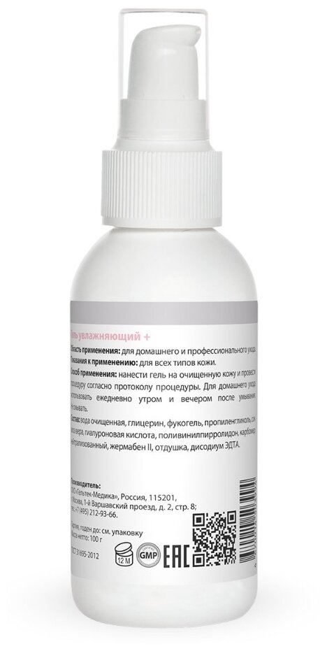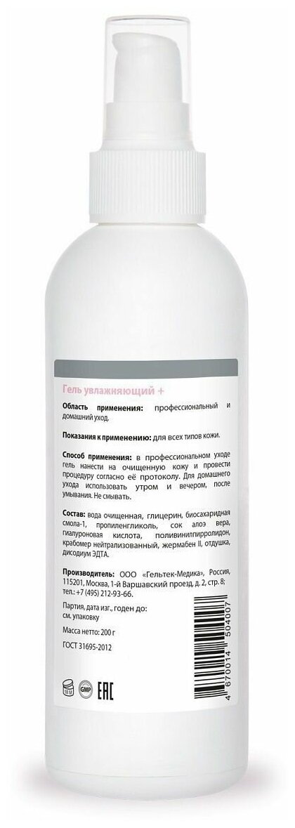 Гель увлажняющий + это косметическое средство для профессионального и домашнего ухода за кожей лица, шеи и декольте с целью качественного увлажнения и защиты кожи от агрессивных факторов внешней среды. Высокомолекулярная гиалуроновая кислота активно увлажняет поверхностные слои кожи, восстанавливает гидролипидную мантию. Сок Алоэ Вера повышает иммунитет клеток кожи, а также является источником необходимых микроэлементов. Фукогель создает оптимальные условия для существования нормальной микрофлоры кожи и способствует повышению уровня увлажнённости эпидермиса, обладает эффектом anti-pollution.