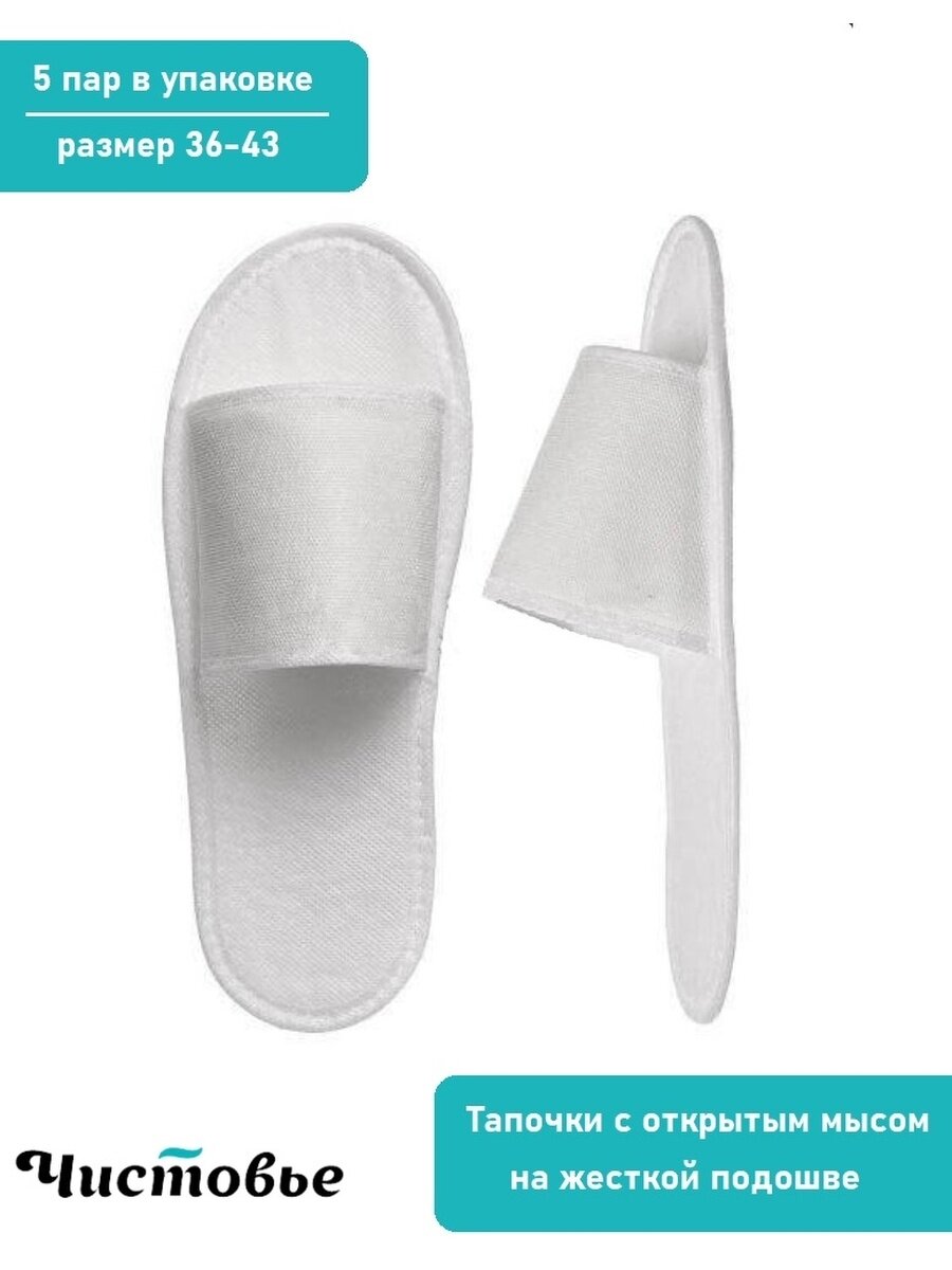Тапочки на жесткой подошве с открытым мысом. Эта модель отличается комбинацией двух материалов: подошва из пенополиэтилена и верх из спанбонда повышенной плотности для комфортного передвижения. Обеспечивают безопасность и комфорт во время медицинских и косметологических процедур, используются при посещении бань, саун, бассейнов, салонов красоты. Служат индивидуальным средством защиты от грибковых заболеваний. Более экономичный аналог махровым тапочкам. Каждая пара в индивидуальной упаковке. Размер универсальный, до 43-его.