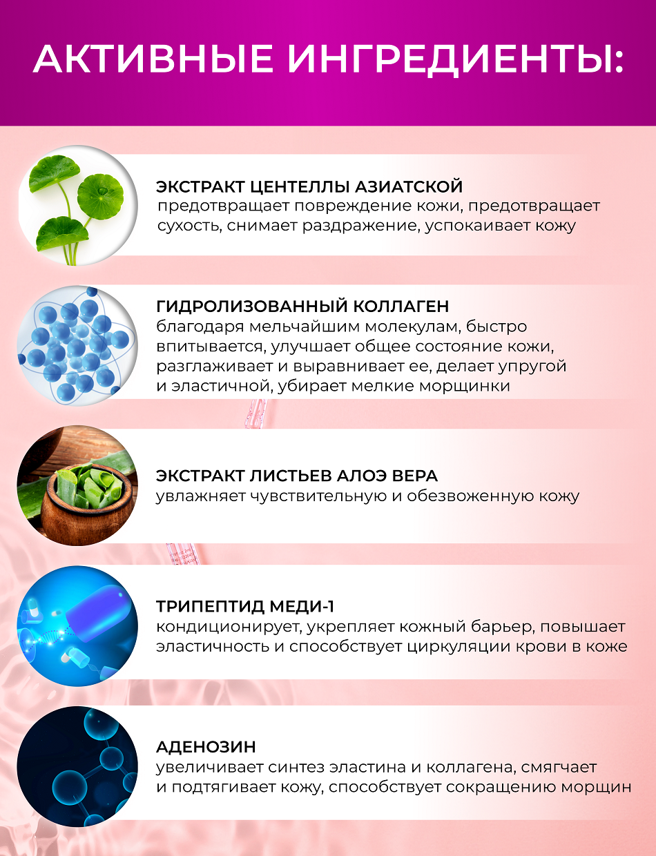 | Состав | Water, Butylene Glycol, Bis-PEG-18 Methyl Ether Dimethyl Silane, 1,2-Hexanediol, PEG-60 Hydrogenated Castor Oil, Caprylyl Glycol, Beta-Glucan, Centella Asiatica Extract, Sodium Chondroitin Sulfate, Copper Tripeptide-1, rh-Oligopeptide-1, Hydrolyzed Collagen, Allantoin, Aloe Barbadensis Leaf Extract, Adenosine, Ethylhexylglycerin, Dipotassium Glycyrrhizate, Rose Flower Oil, CI 42090, CI 17200 |