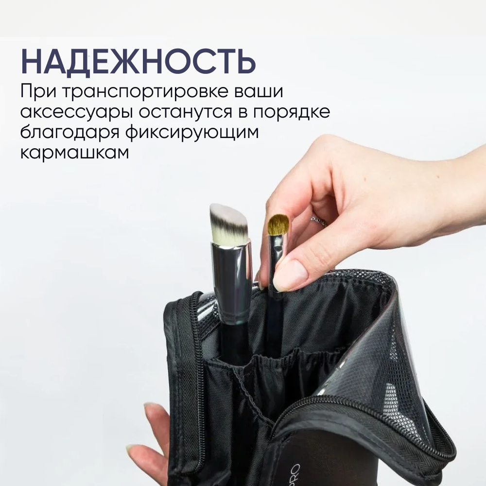 Тубус из специального лёгкого материала на молнии для хранения и транспортировки аксессуаров и кистей для макияжа. Тубус закрывается с помощью молнии. Благодаря особой форме и плотному материалу тубус поможет уберечь инструменты от механических повреждений, защитит их от пыли, влаги и поможет им сохранить первозданный вид. Верх тубуса выполнен из прозрачного материала, что удобно для визуальной наглядности его наполнения. В раскрытом виде он устойчив, не занимает много места и поможет правильно организовать рабочую зону.