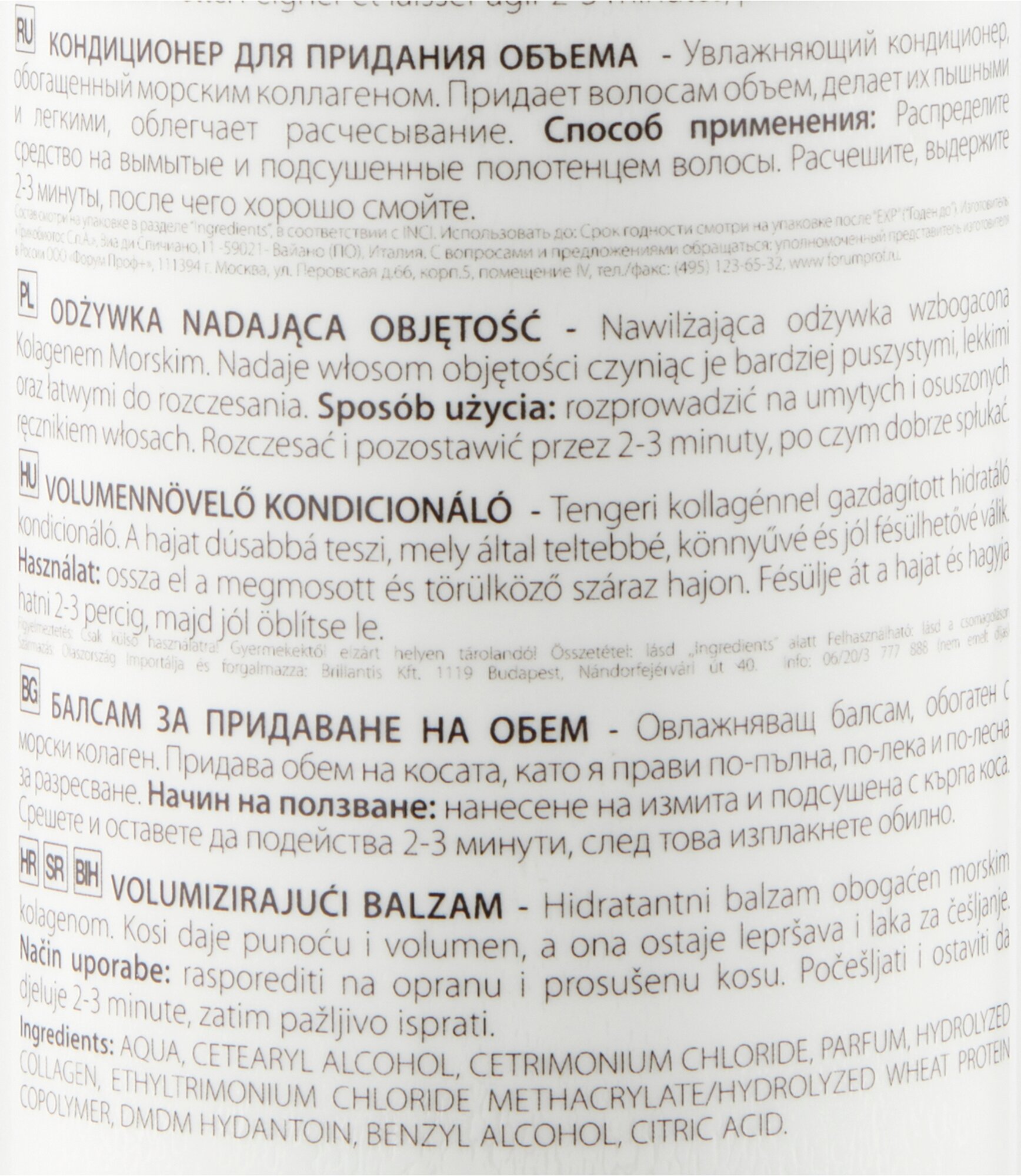 Содержит специальную формулу для придания волосам выраженного объёма и упругости. Входящий в состав морской коллаген обволакивает поверхность каждого волоса, обеспечивая дополнительную прочность, эластичность и здоровый блеск. Мгновенно делает волосы уплотнёнными и пластичными, заметно облегчает расчёсывание.