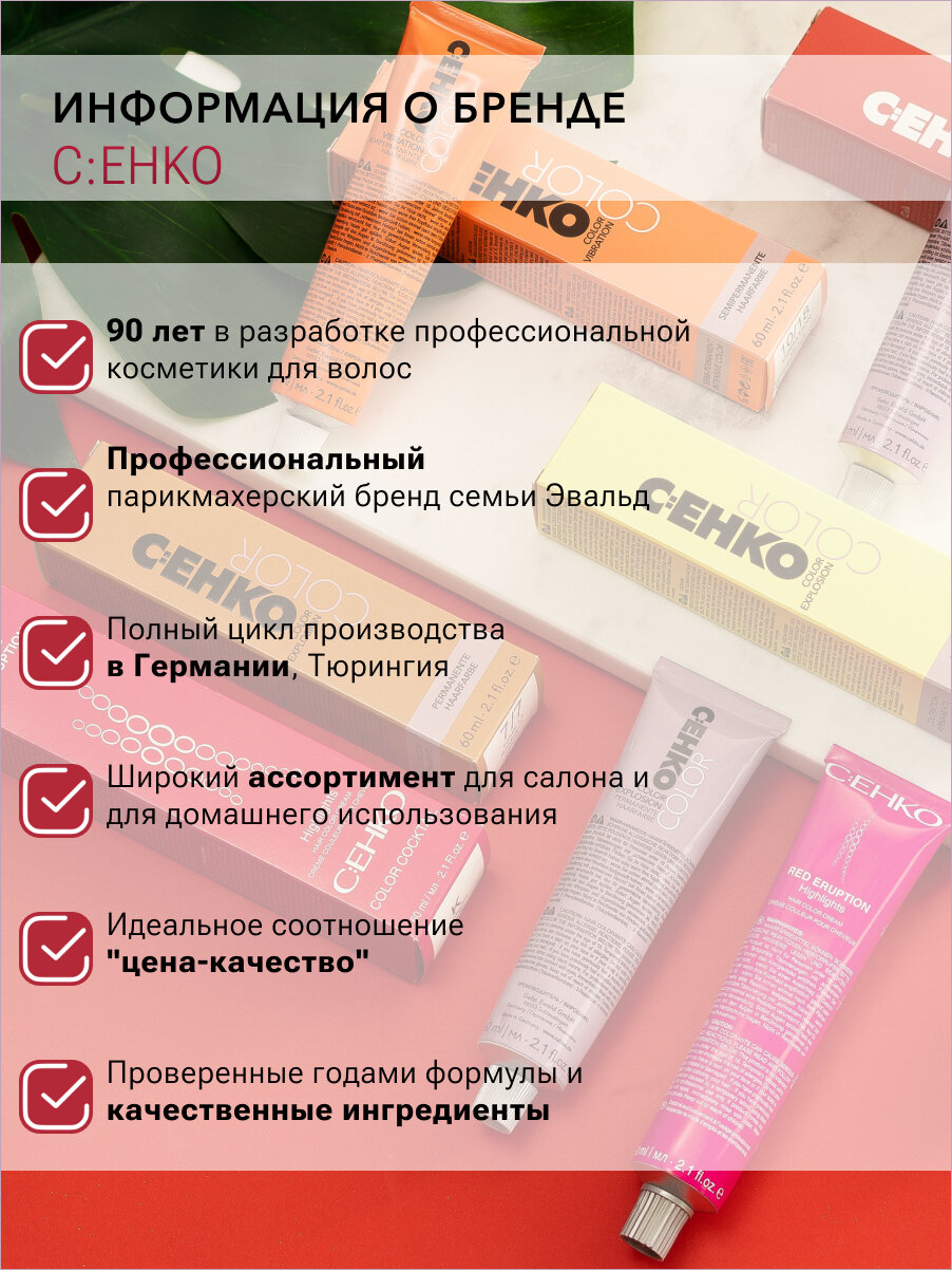 Работает с окислителем C:EHKO PEROXAN 1,9% и 3%. Смешивается с окислителем в пропорции 1:2. Объем 60 мл. Все оттенки тонирующей крем-краски превосходно смешиваются между собой. Для получения более интенсивного тонирующего эффекта рекомендуется добавить в тонирующую крем-краску C:EHKO Color Vibration соответствующий микстон.