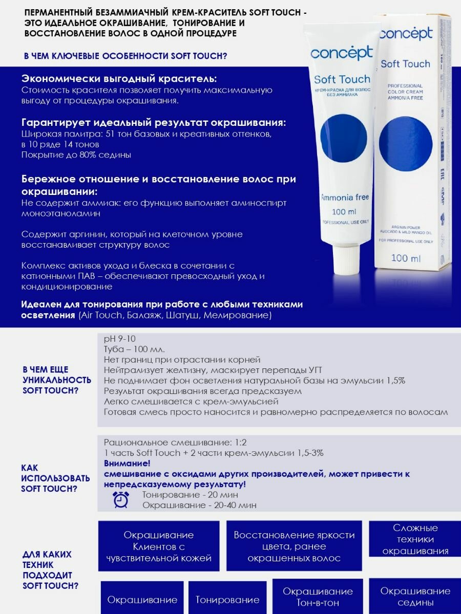Крем-краска CONCEPT Soft Touch - стойкое безаммиачное окрашивание. Безаммиачные красители Soft Touch позволяют объединять в одной процедуре окрашивание и уход. Краска содержит триэтаноламин - регулятор рН - обеспечивающий эффективность всех компонентов, входящих в состав крем-краски - аргинин, льняное масло, кондиционирующие добавки, придающие волосам шелковистость, эластичность и блеск.